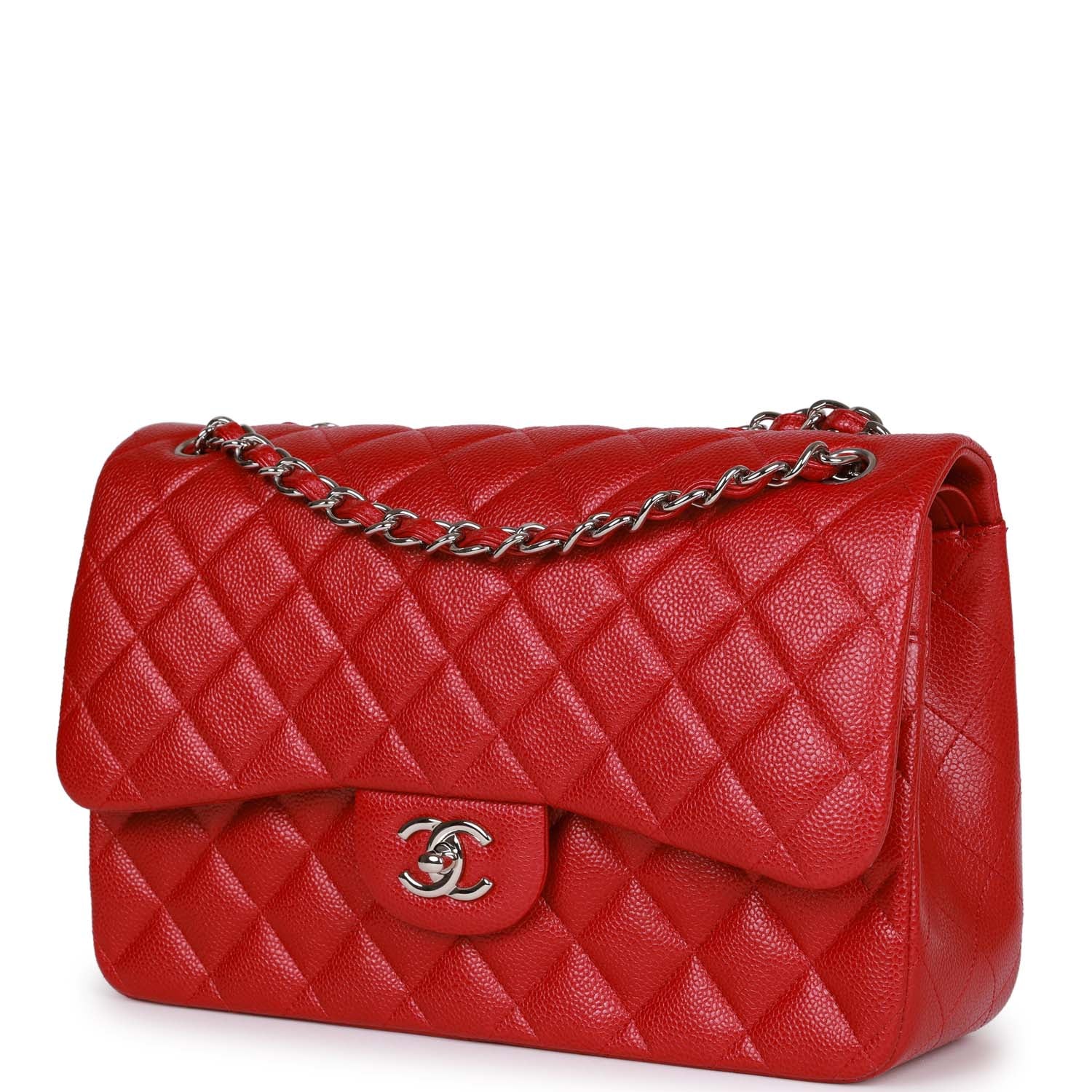 This Jumbo Classic Double Flap bag is in Red quilted caviar leather with silver tone hardware, front flap with CC turnlock closure, half moon back pocket and adjustable interwoven silver tone chain link and red?leather shoulder/crossbody strap.