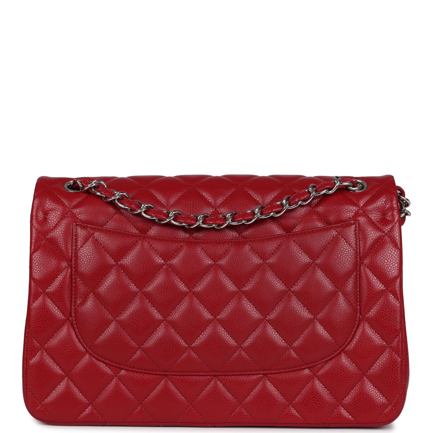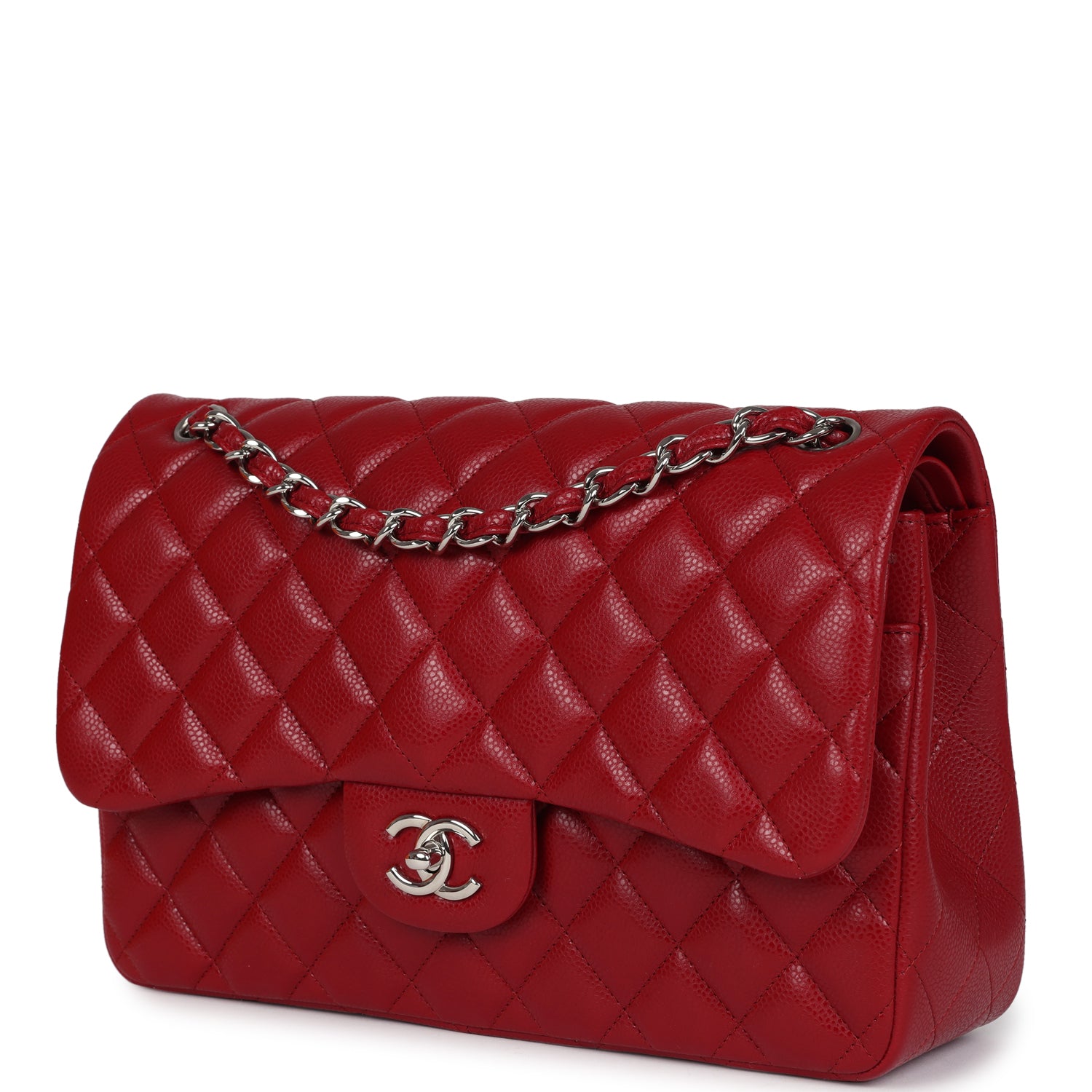 This Jumbo Classic Double Flap bag is in red caviar leather with silver tone hardware and features a front flap with signature CC turnlock closure, half moon back pocket, and adjustable interwoven silver tone chainlink and red leather shoulder strap.