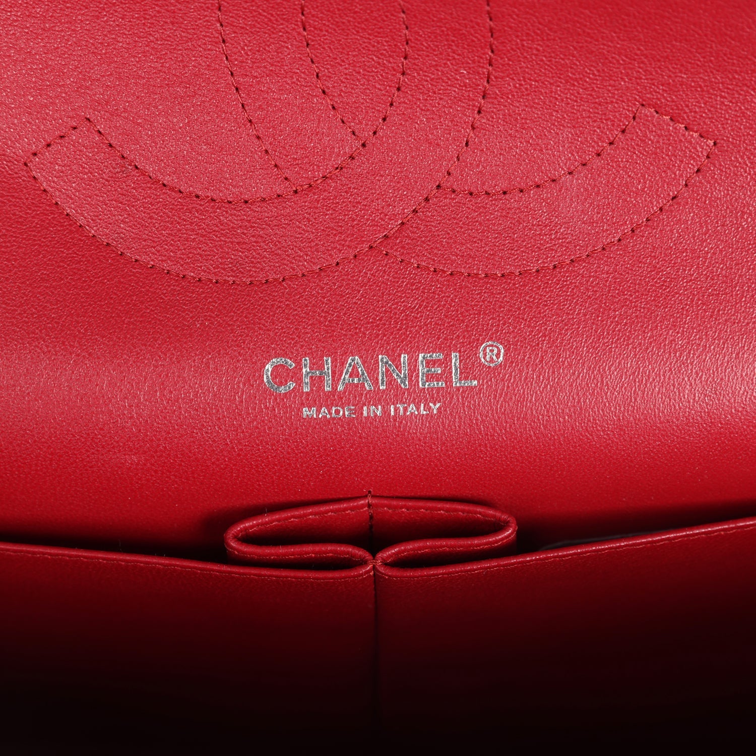 The interior is lined in red leather with a "love letter" zipper compartment under the first flap, an "outer" slit pocket under the second flap, and an interior compartment with two open pockets separated by a "lipstick" compartment.