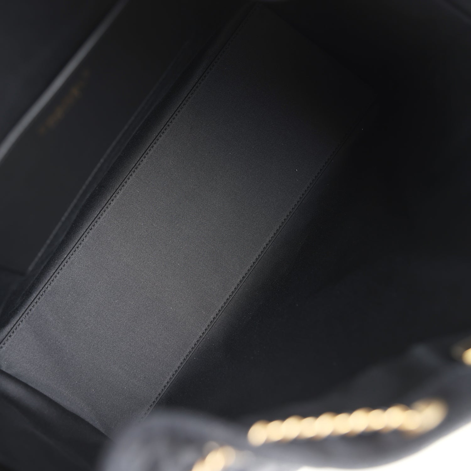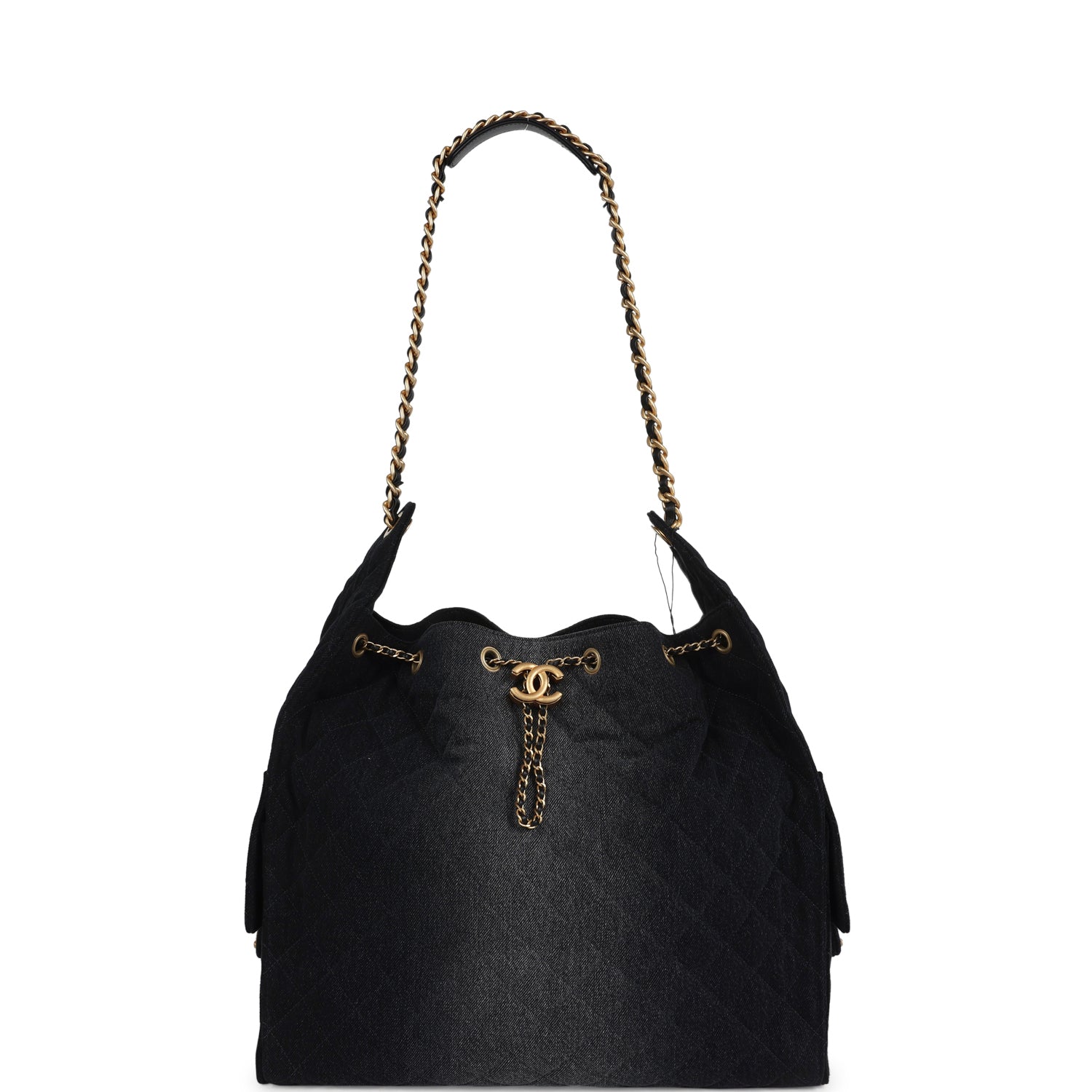 This Chanel Large 25 Hobo Bag is in black washed denim fabric with antique gold hardware, features signature diamond quilt, two exterior side pockets, drawstring closure, a removable pouch, and a single interwoven antique gold and Black leather shoulder strap.