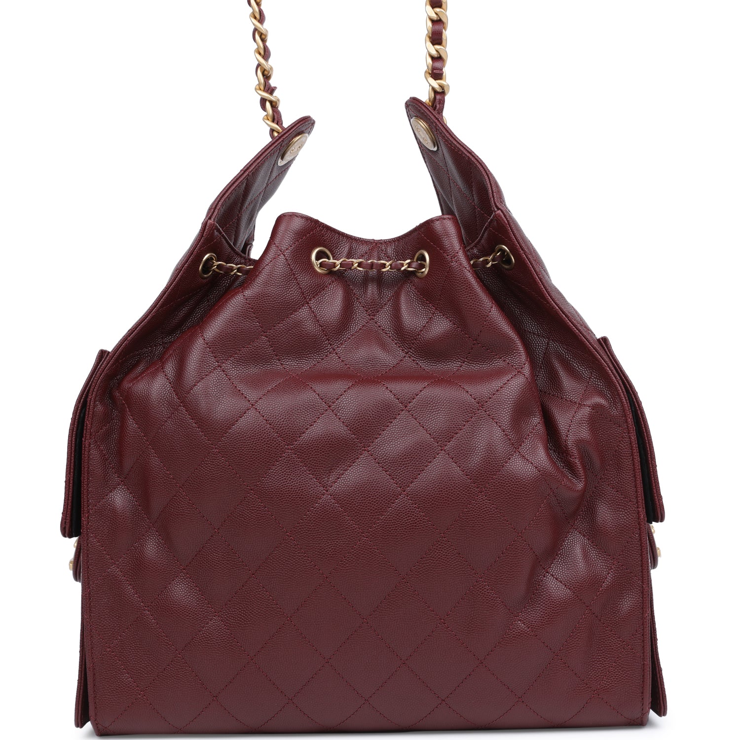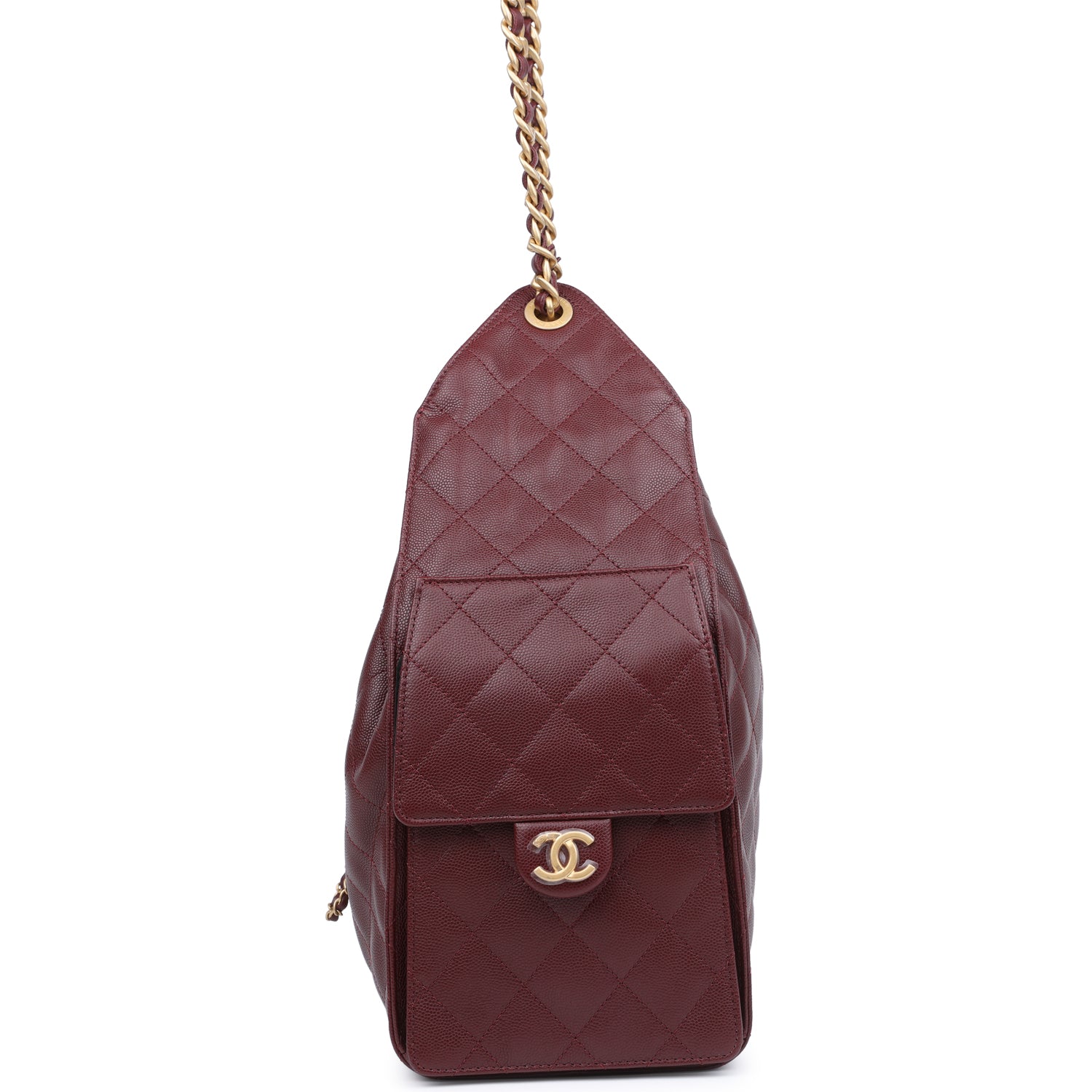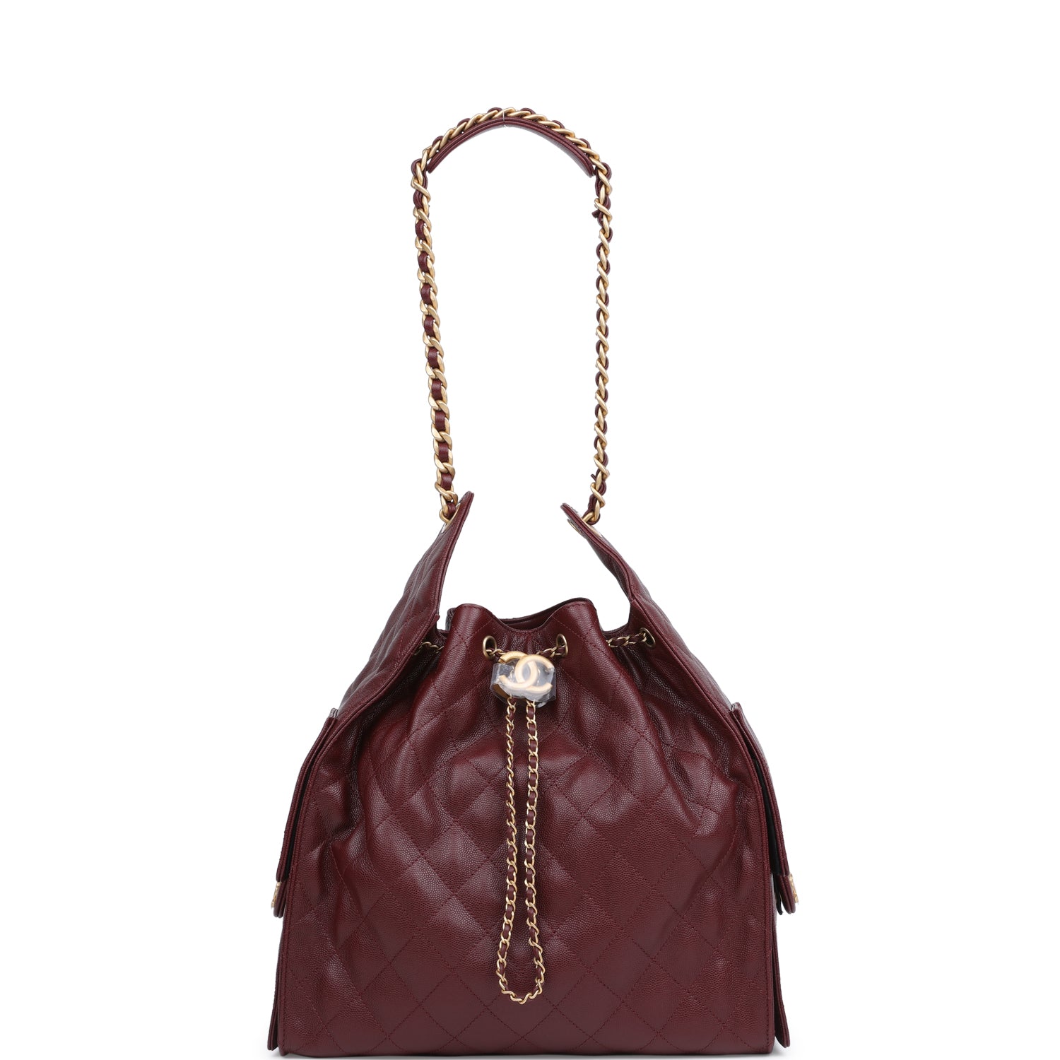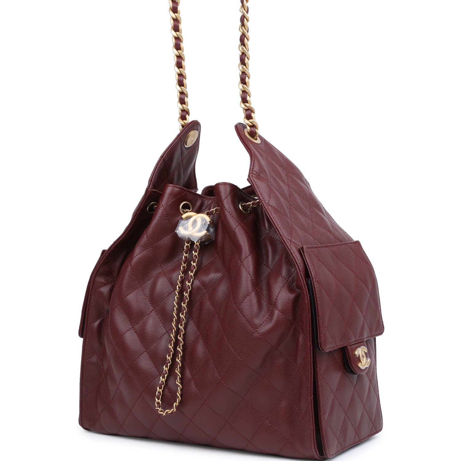 This Chanel Medium 25 Hobo Bag is in burgundy caviar leather with antique gold hardware, features signature diamond quilt, two exterior side pockets, drawstring closure, a removable pouch, and a single interwoven antique gold and burgundy leather shoulder strap.
