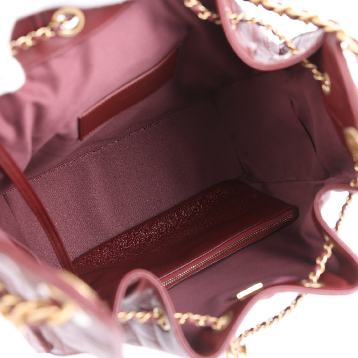 The interior is lined in burgundy grossgrain fabric and has three small slit pockets; one on the rear wall and one slit pocket on each interior side
