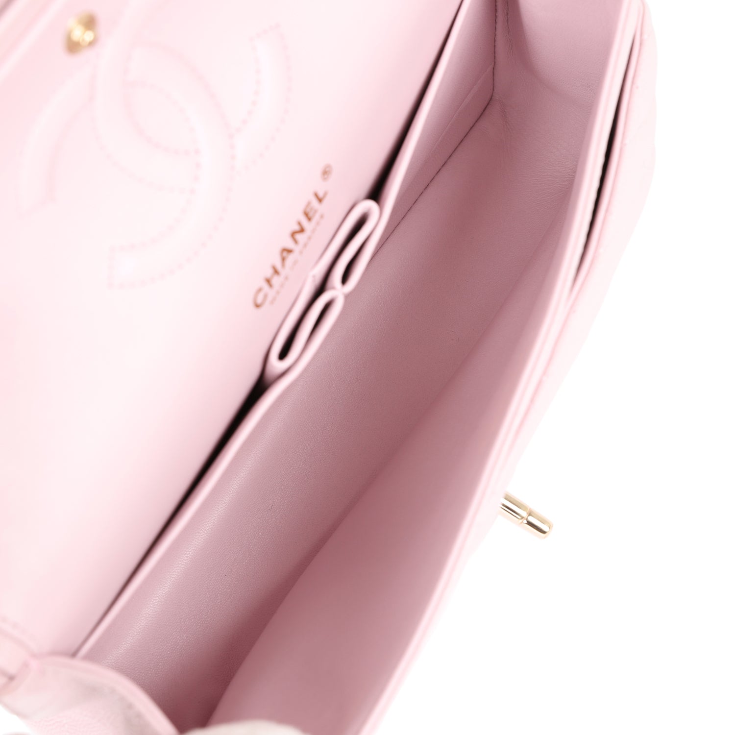 The interior is lined in Light Pink leather with the "love letter" zipper compartment underneath the first flap,?an "outer" slit pocket under the second flap, and an interior compartment with two open pockets separated by a "lipstick" compartment.