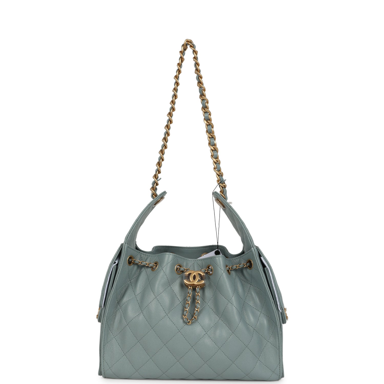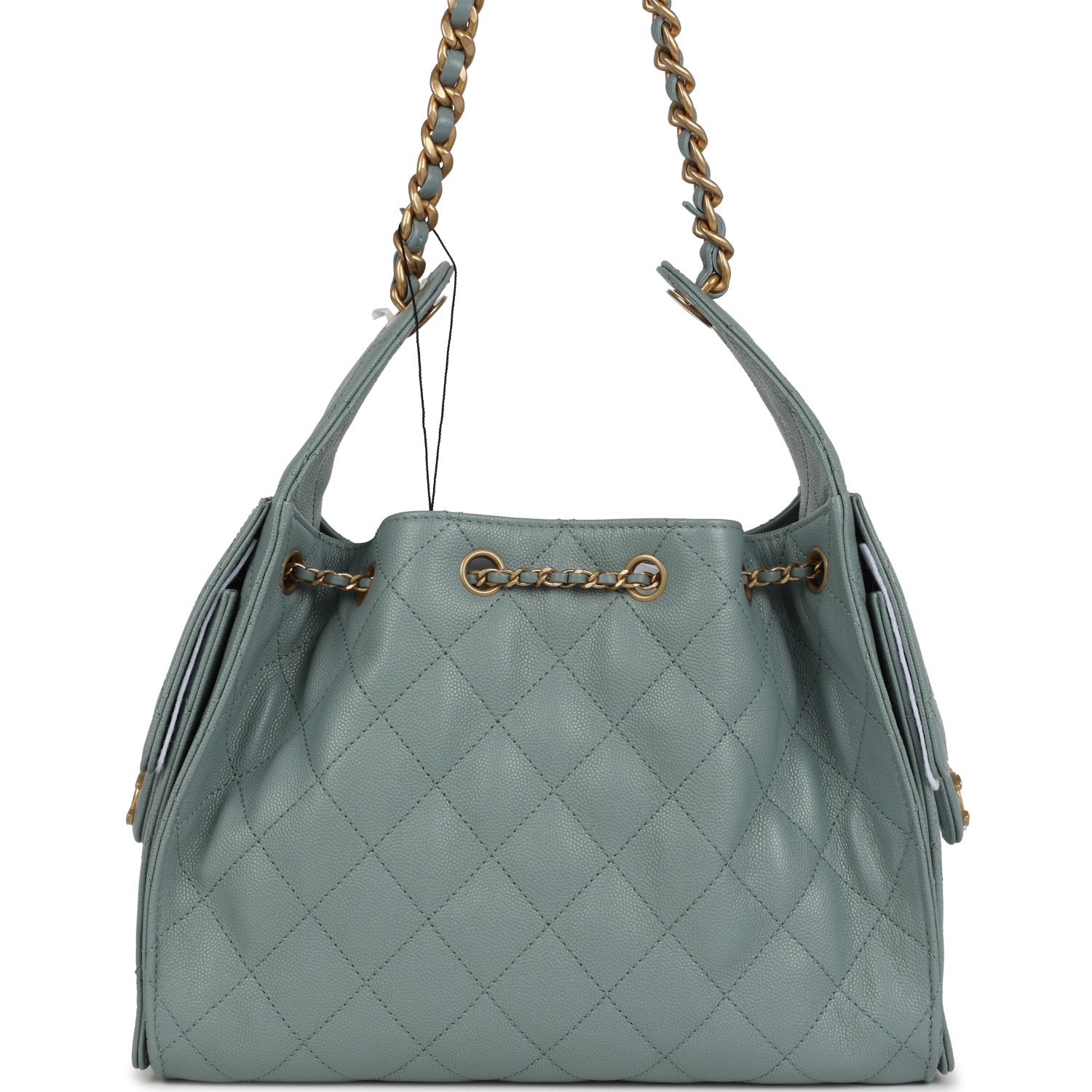 This Chanel?Small 25 Hobo Bag is in green caviar leather with antique gold hardware, features signature diamond quilt, two exterior side pockets, drawstring closure, and a single interwoven antique gold and green leather shoulder strap.