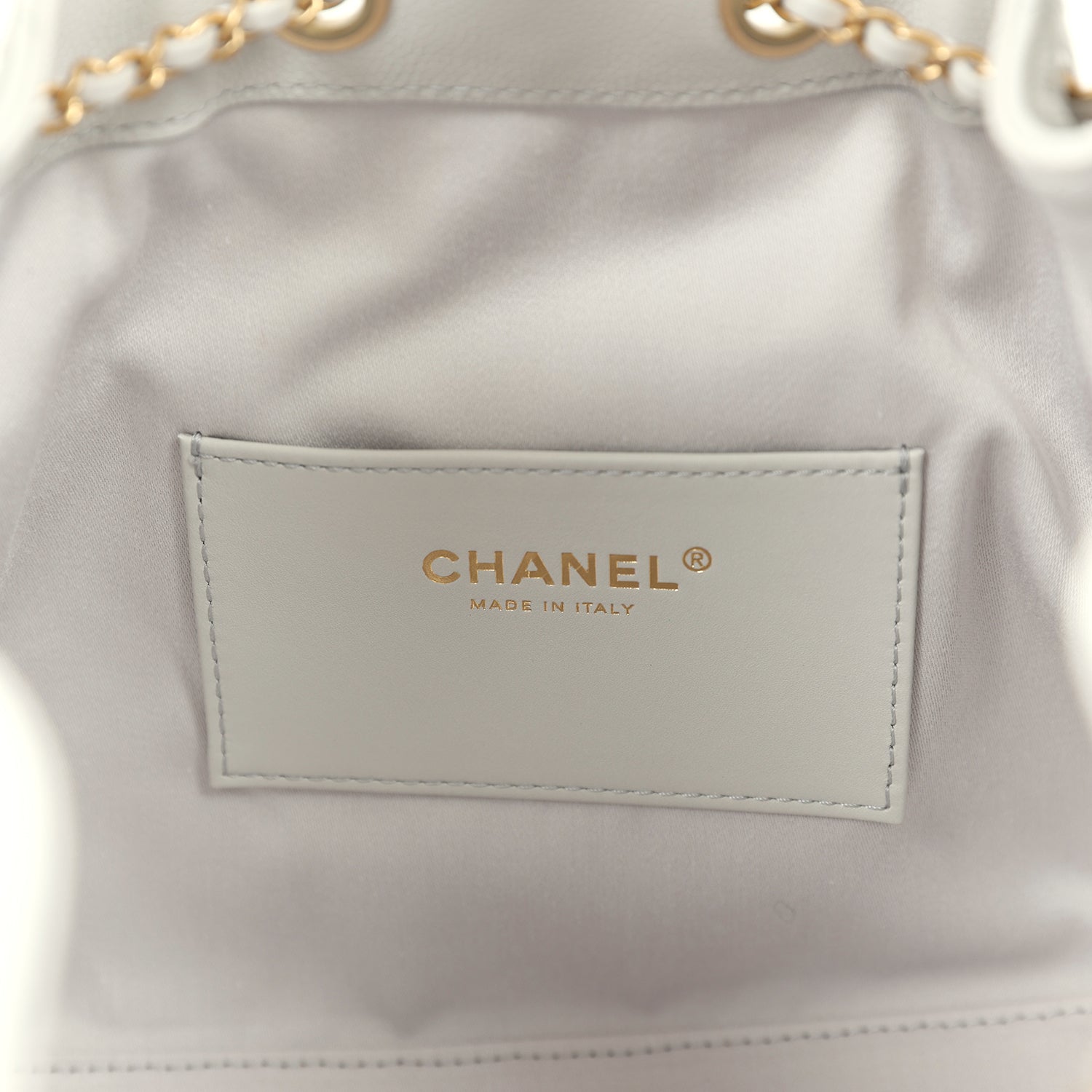 The interior is lined in light grey grossgrain fabric and has three small slit pockets; one on the rear wall and one slit pocket on each interior side.