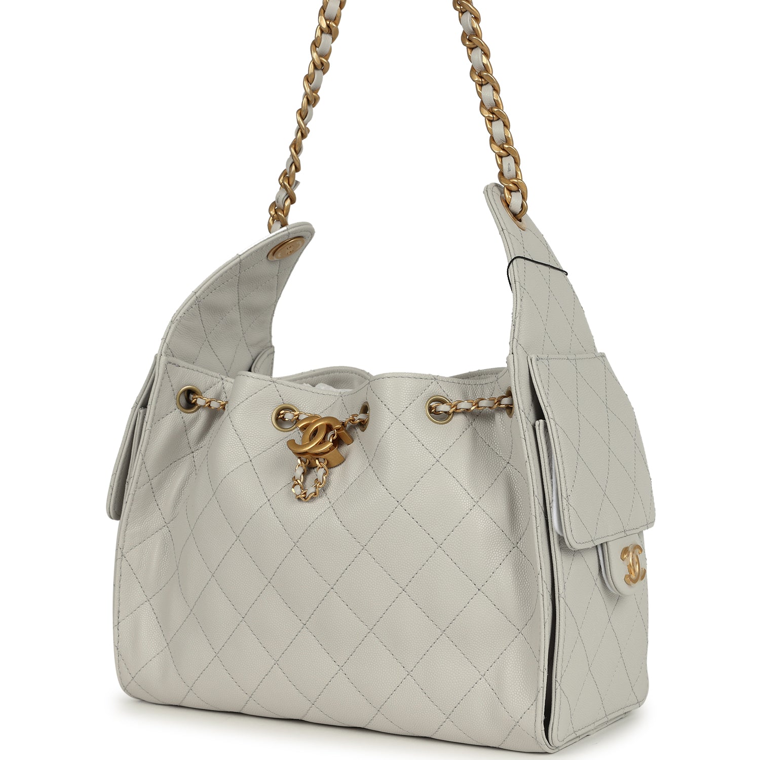 This Chanel?Small 25 Hobo Bag is in light grey caviar leather with antique gold hardware, features signature diamond quilt, two exterior side pockets, drawstring closure, and a single interwoven Antique gold and Light Grey leather shoulder strap.