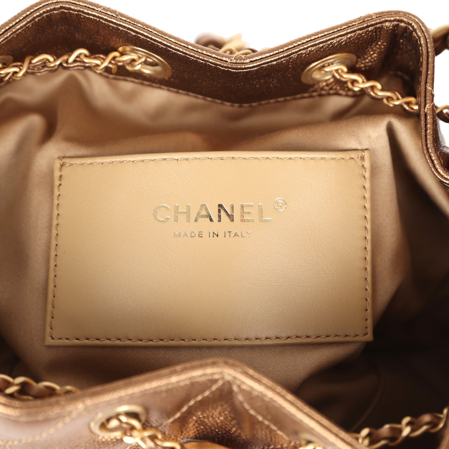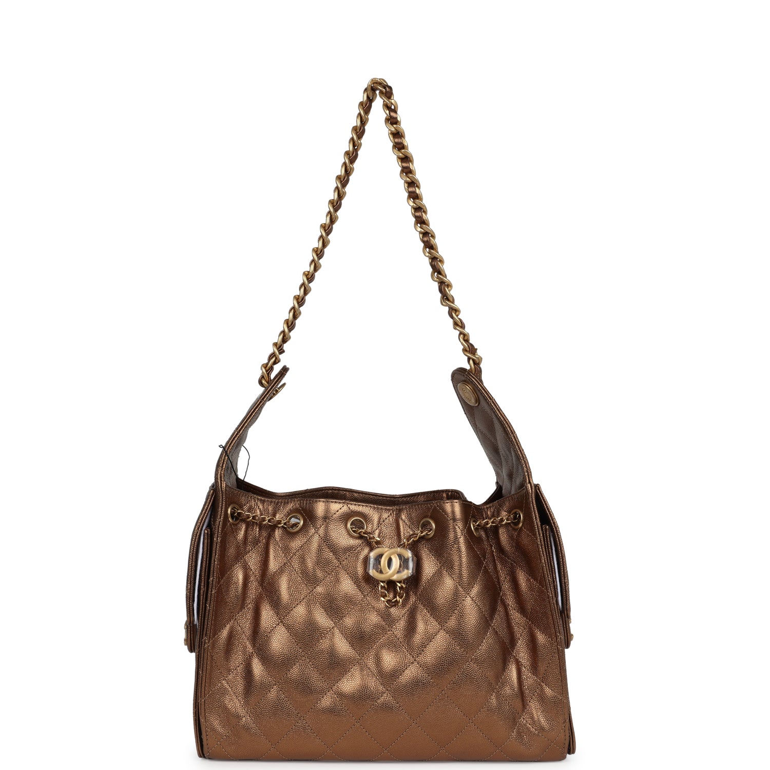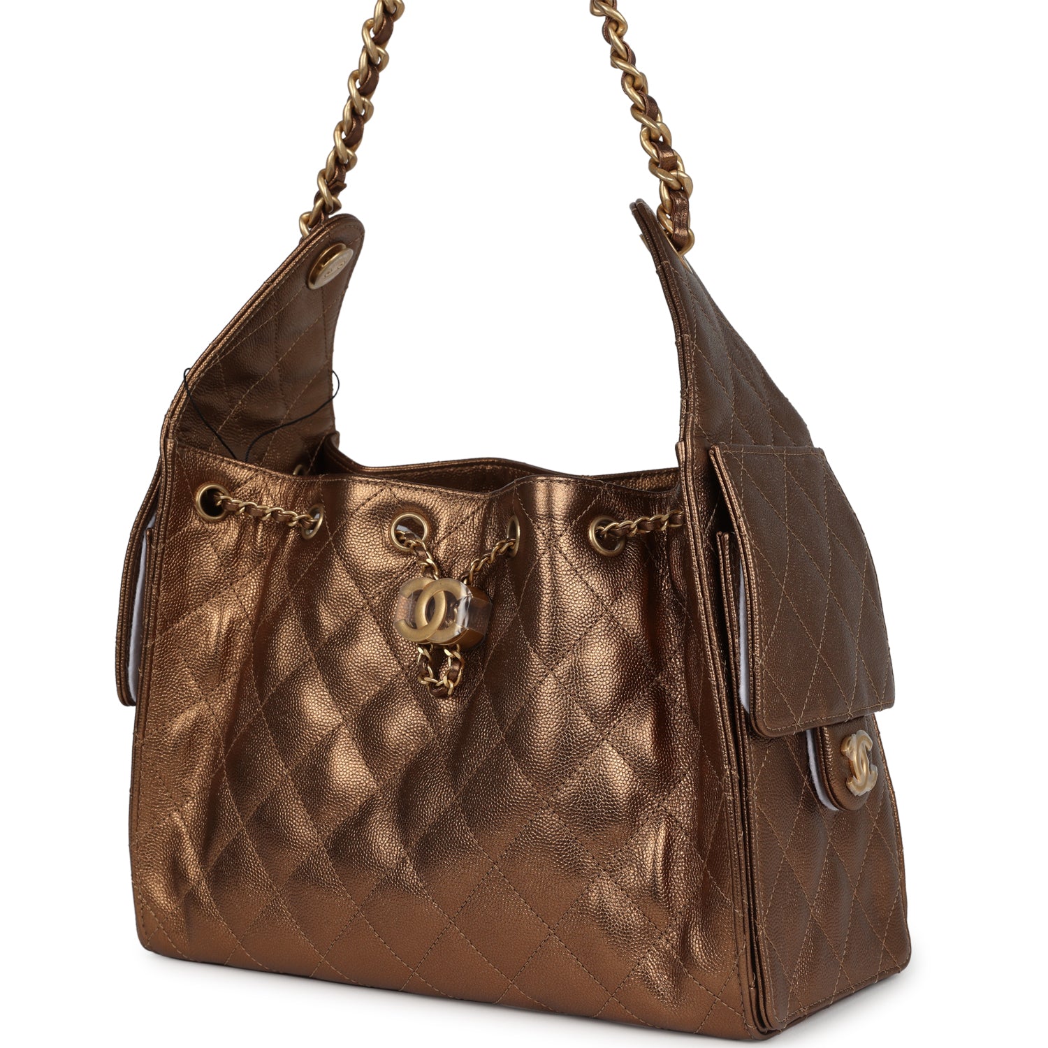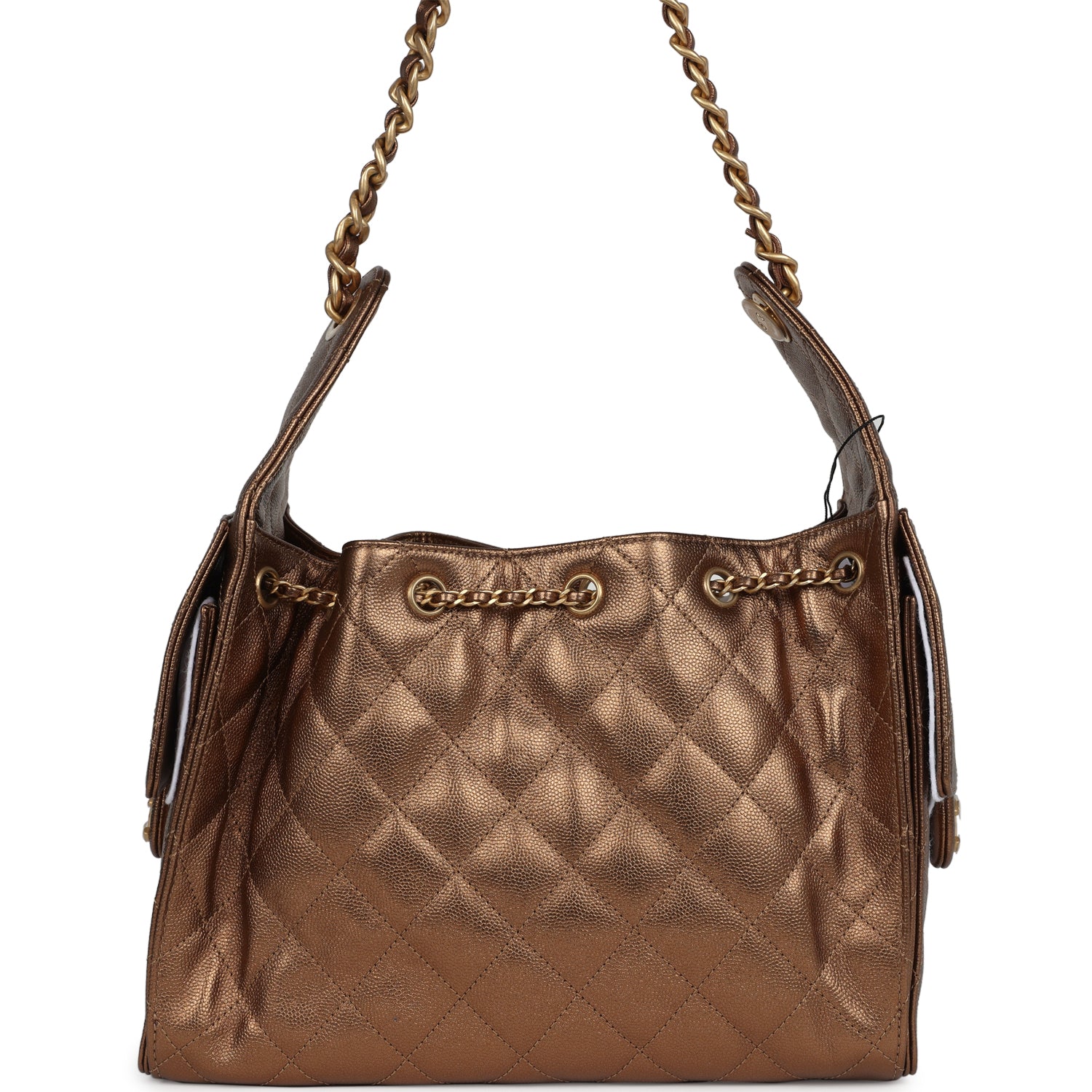 This Chanel?Small 25 Hobo Bag is in metallic bronze caviar leather with antique gold hardware, features signature diamond quilt, two exterior side pockets, drawstring closure, and a single interwoven antique gold and metallic bronze leather shoulder strap.