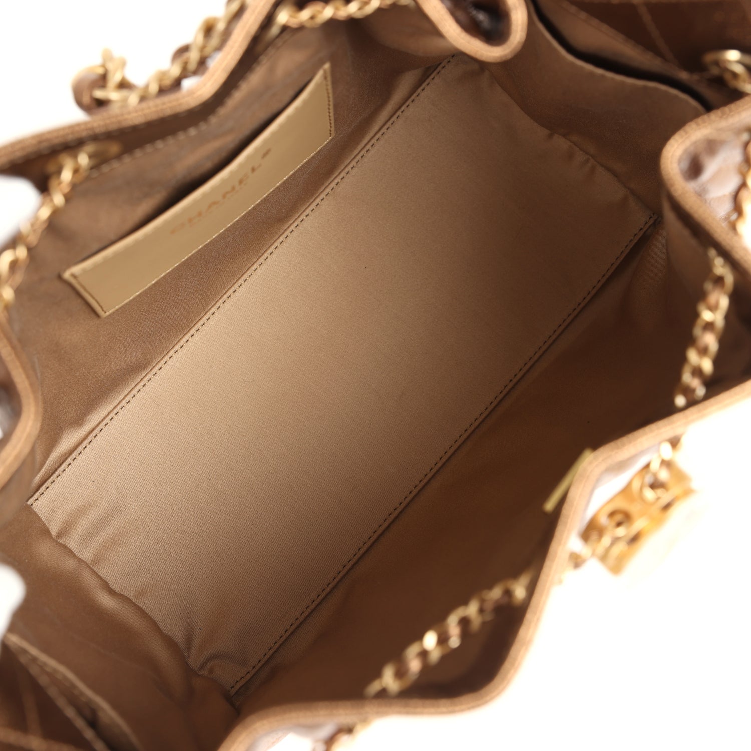 The interior is lined in metallic bronze rossgrain fabric and has three small slit pockets; one on the rear wall and one slit pocket on each interior side.