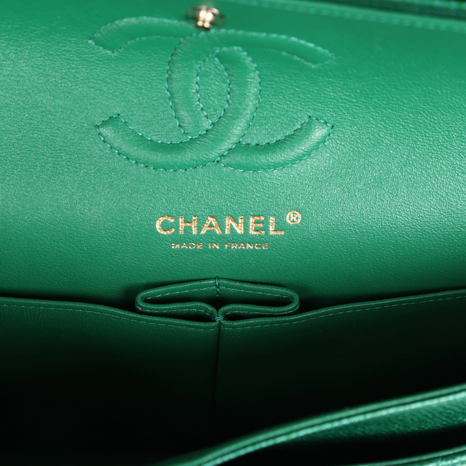The interior is lined in emerald green leather with the "love letter" zipper compartment underneath the first flap, an "outer" slit pocket under the second flap, and an interior compartment with two open pockets separated by a "lipstick" compartment.