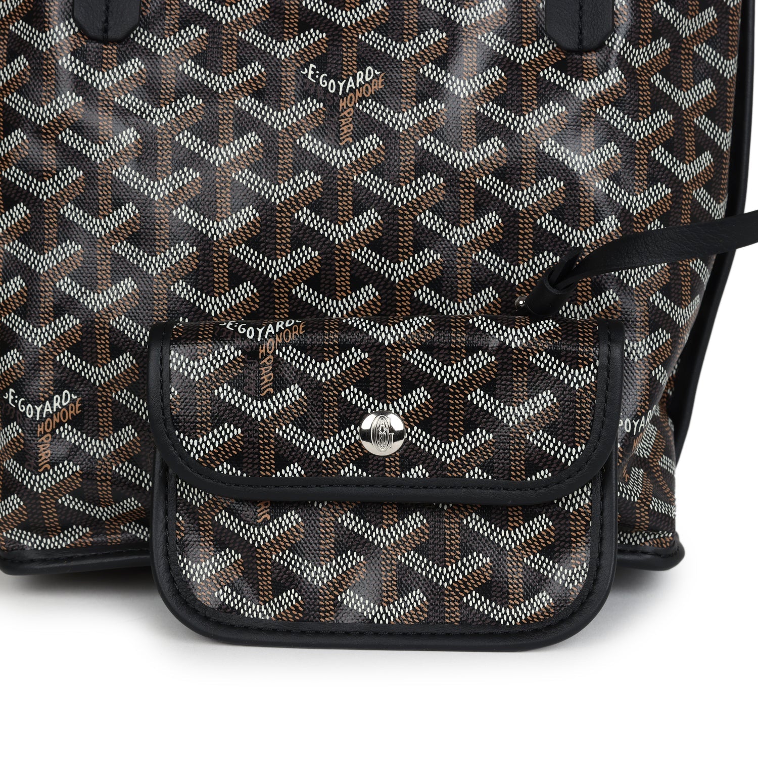 This Anjou Mini bag is of black Goyardine canvas with palladium hardware, contrast stitching,?black?chevroches calfskin lining, and a detachable black coin purse