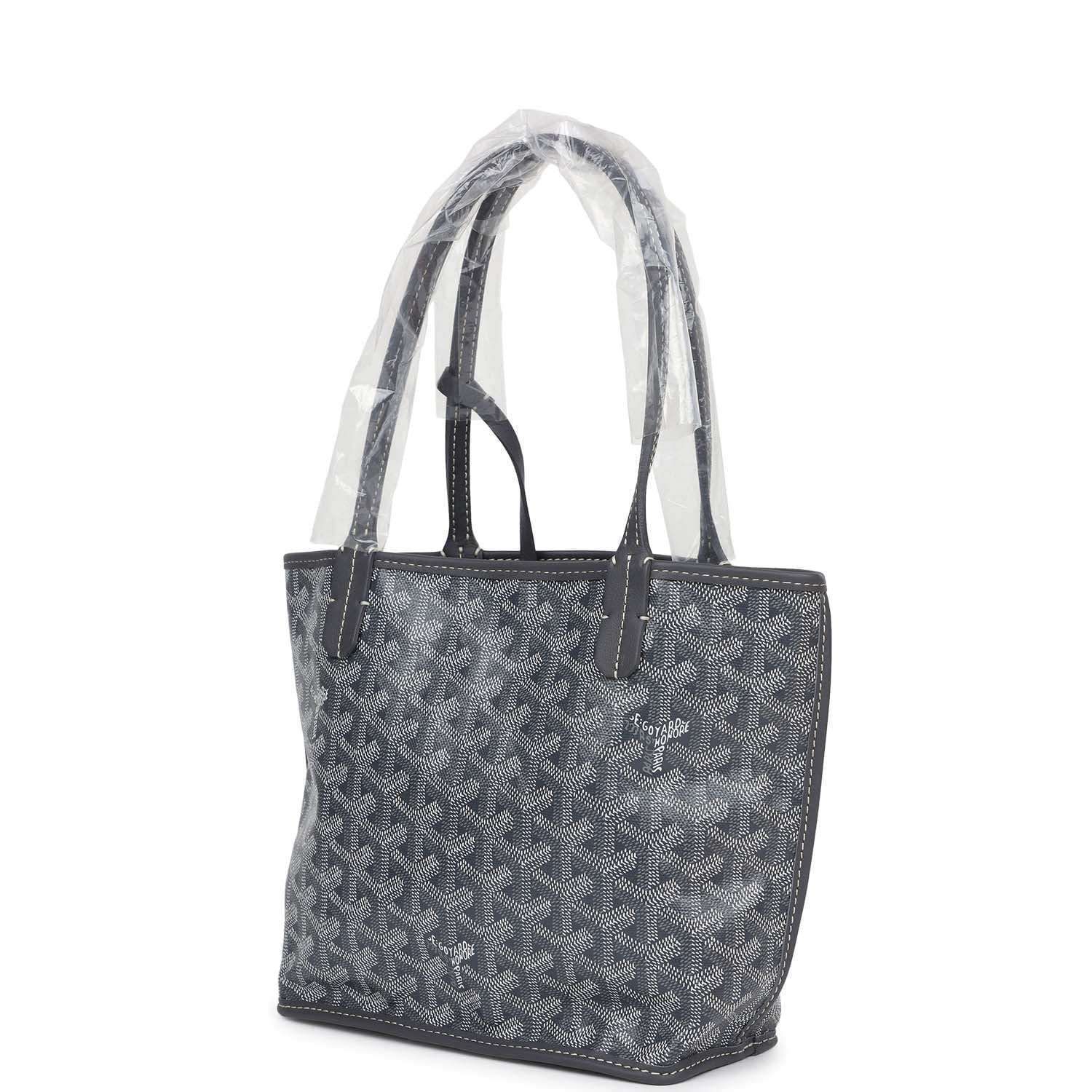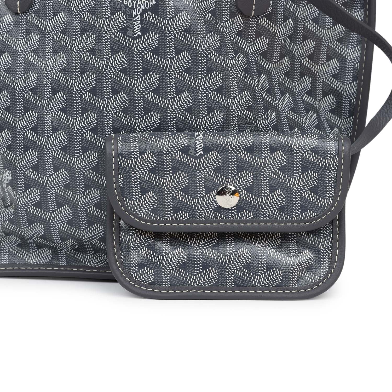 This Anjou Mini reversible tote is of grey Goyardine canvas and leather with palladium hardware and features grey leather handles and trim, removable pouch and contrast white stitching.