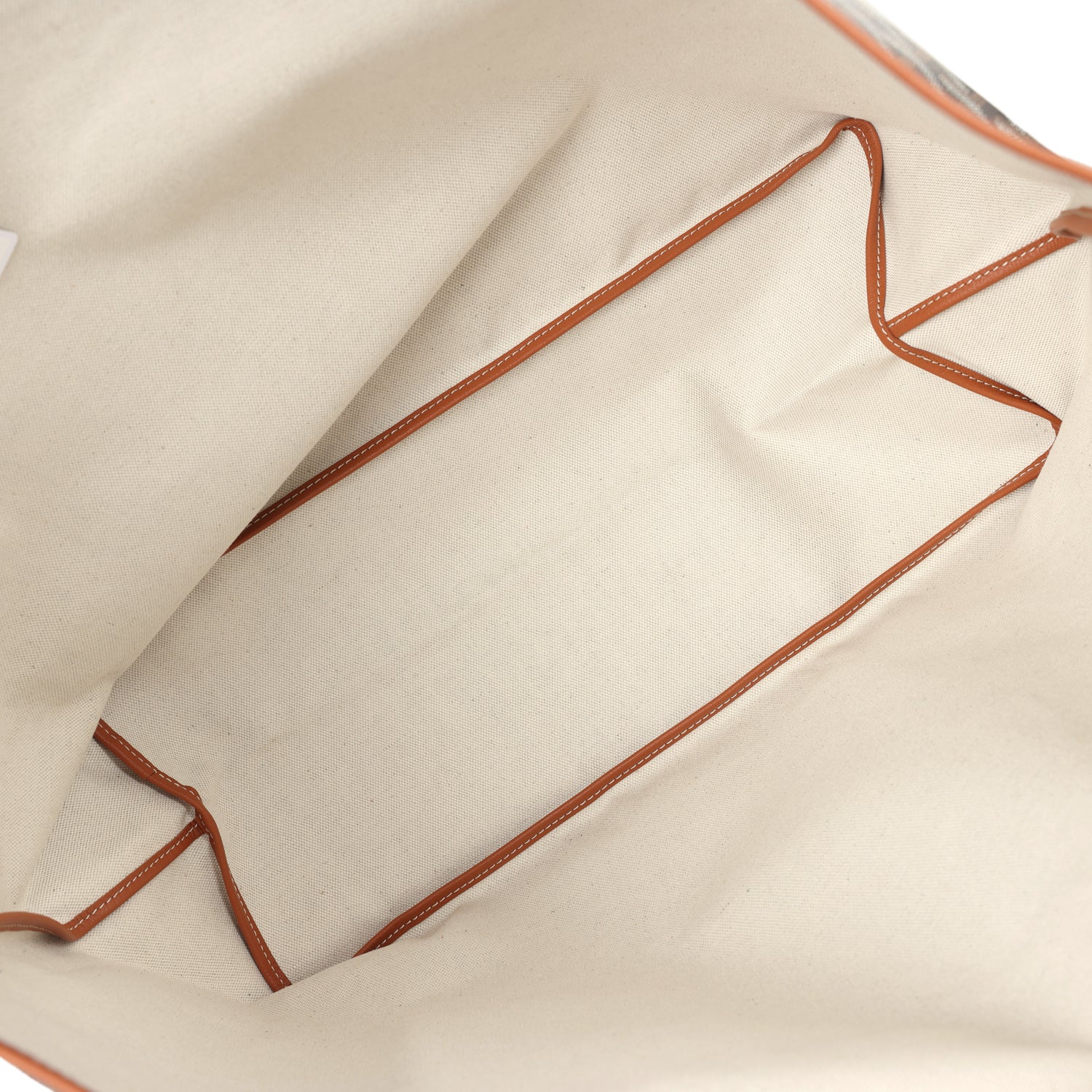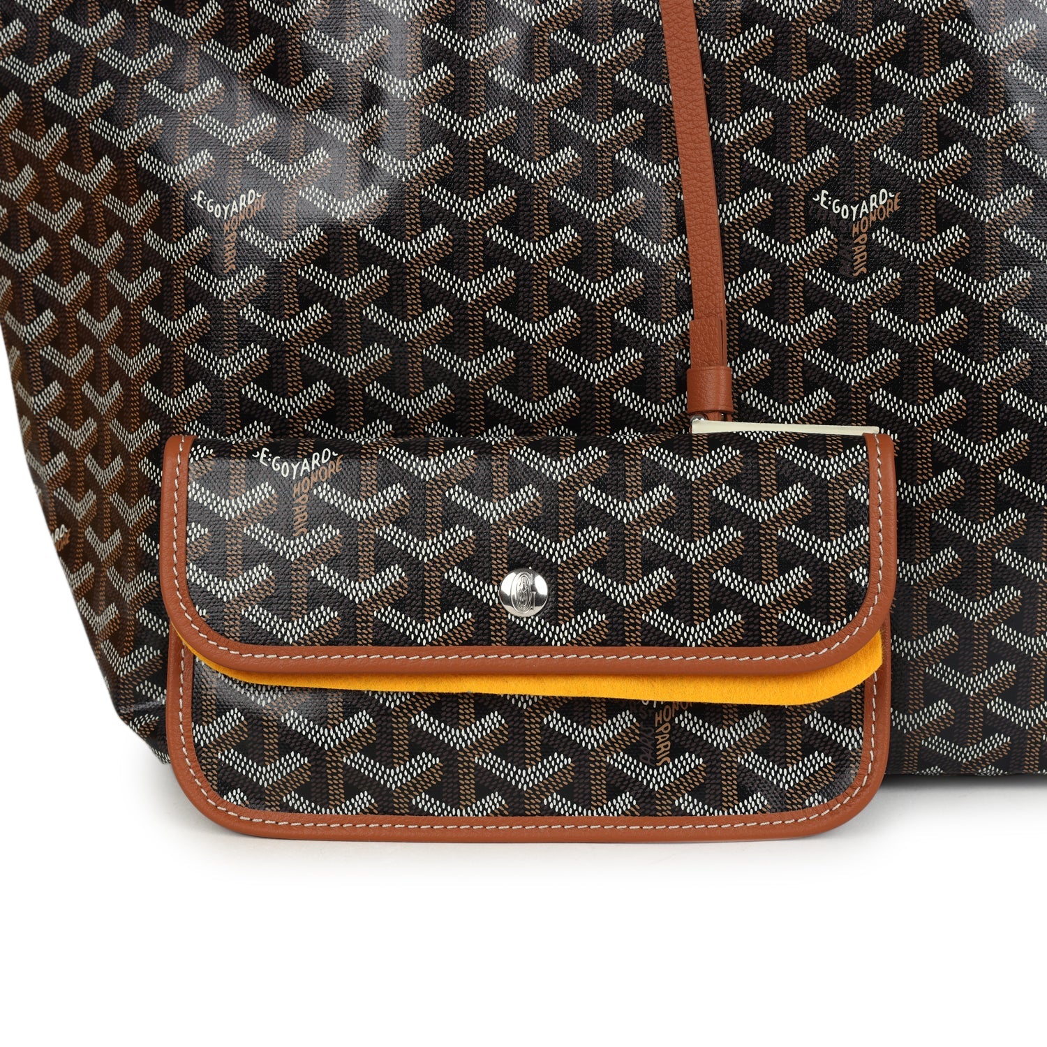 ThisSaint Louis GM tote is in black Goyardine coated canvas and tan Chevroches calfskin leather with palladium hardware, contrast stitching, two flat top handles, and has a matching detachable button closure wallet.