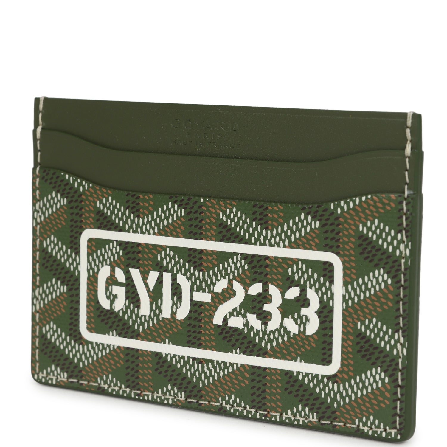 The 2025 limited edition Goyard Goyardine Canvas Khaki Saint-Sulpice Card Holder Wallet featuring "GYD-233" hand printed on the front of the card holder and contrast white stitching.