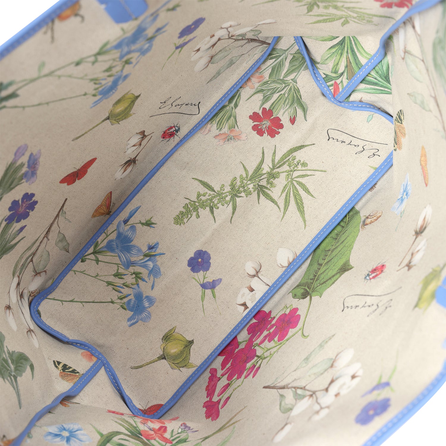 The interior is lined with a multicolored floral print canvas.