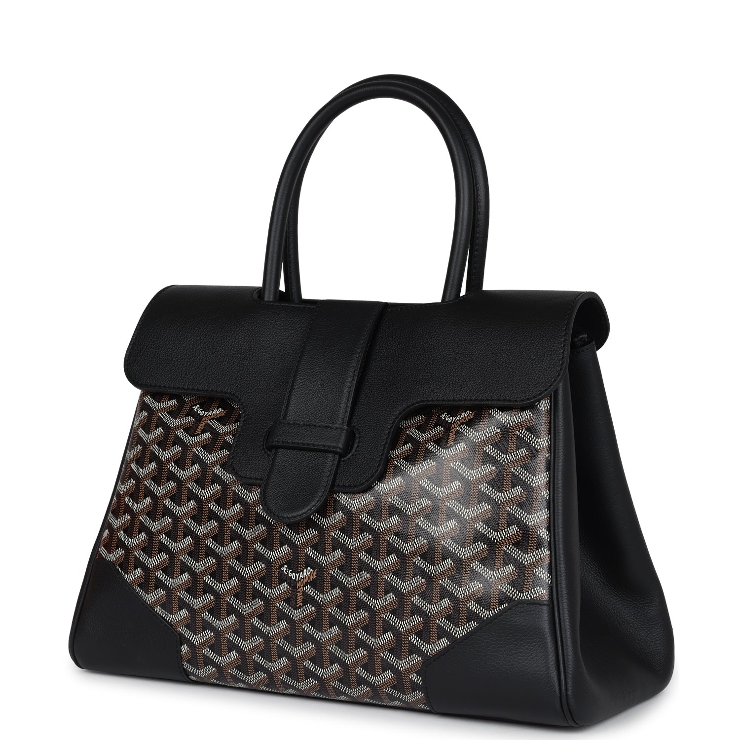 This?Soft Saigon Tote is in black Goyardine coated canvas and Chevroches calfskin with palladium hardware, tonal stitching, features two double rolled top handles, signature saigon leather strap and loop closure, a cutout in the top of the flap for the handle to fit through.