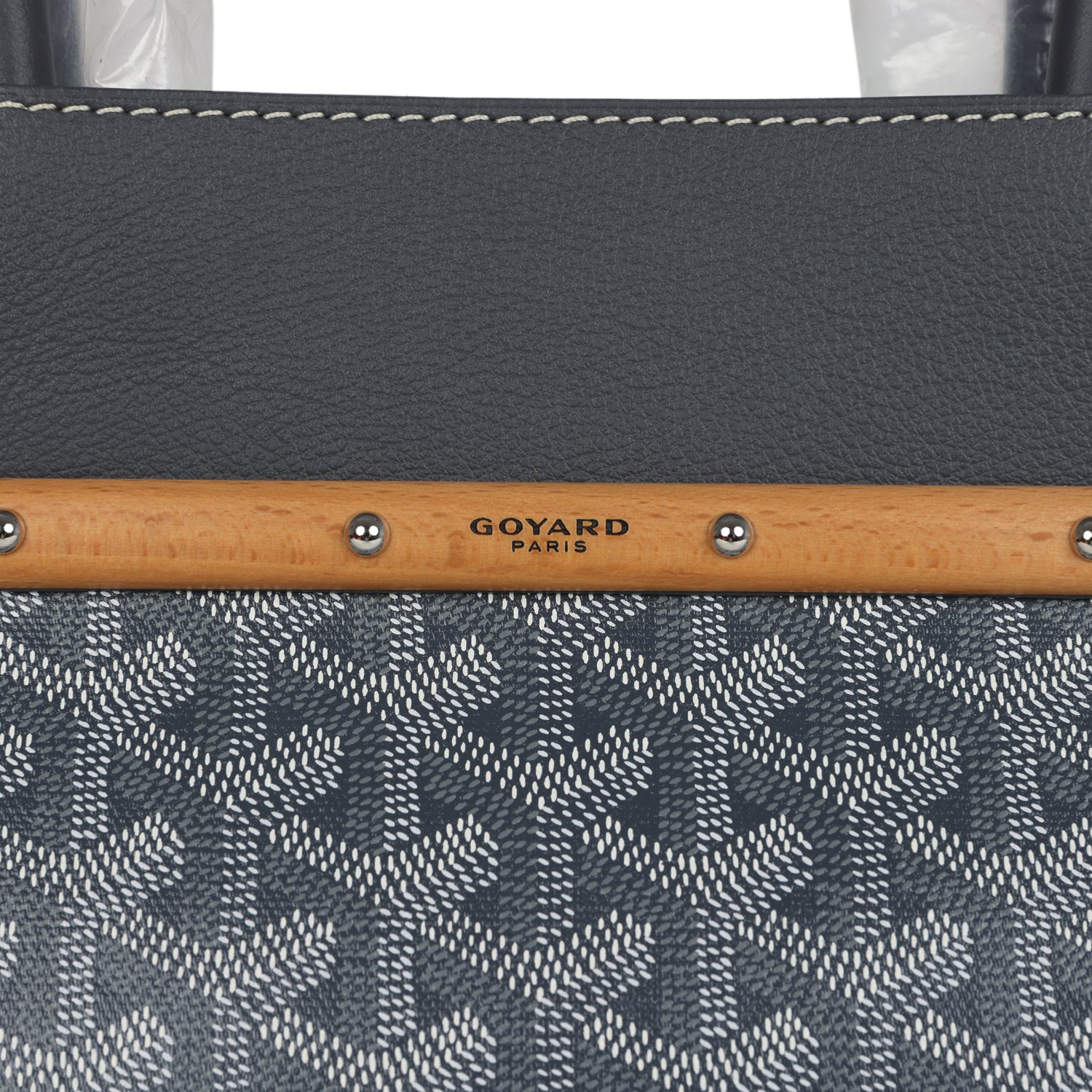 The interior is lined is white canvas and grey chevroches calfskin, single floating pocket and a wooden detail on back of bag with palladium studs.