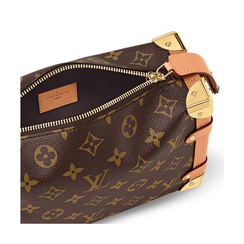 Returning to the House’s trunkmaking beginnings, Nicolas Ghesquière creates the Side Trunk MM handbag in Monogram canvas with leather trim. What strikes the eye is the singularity of the leather zip tab fitted with the iconic S-lock and the reinforced metallic corners. The wide top handle is removable as is the thin leather shoulder strap.