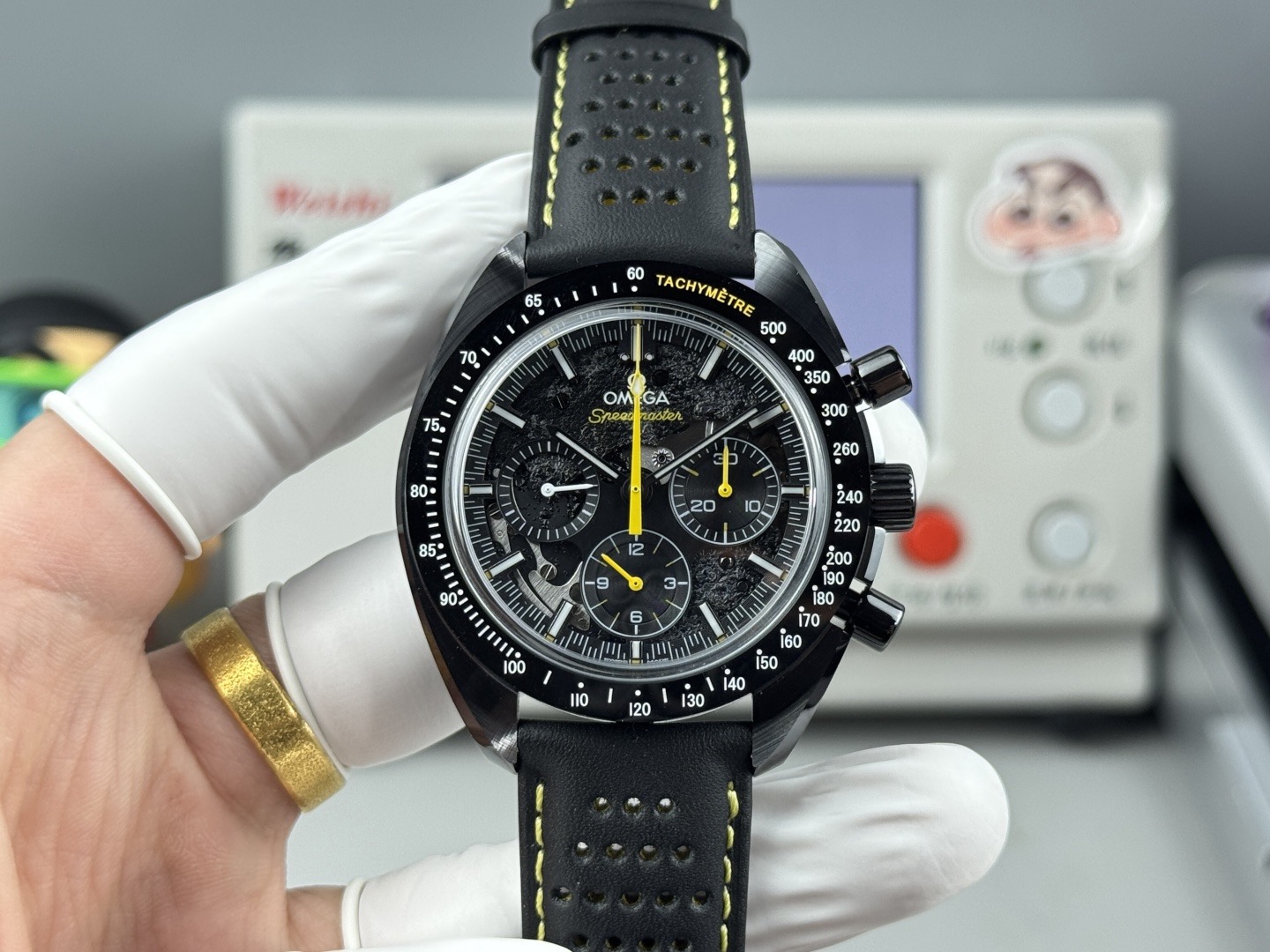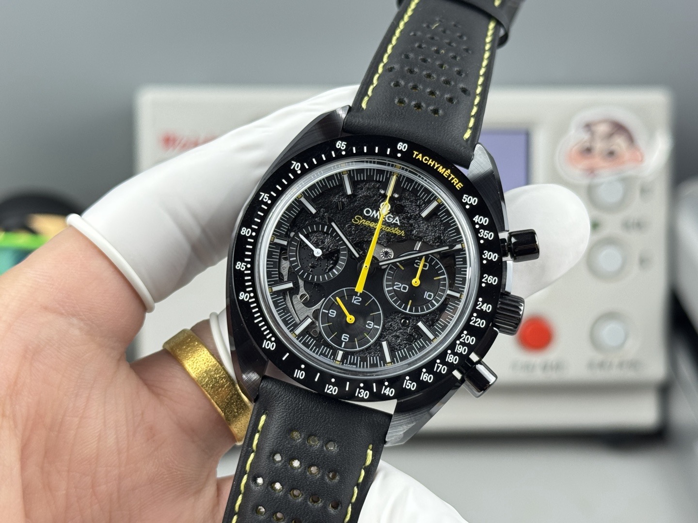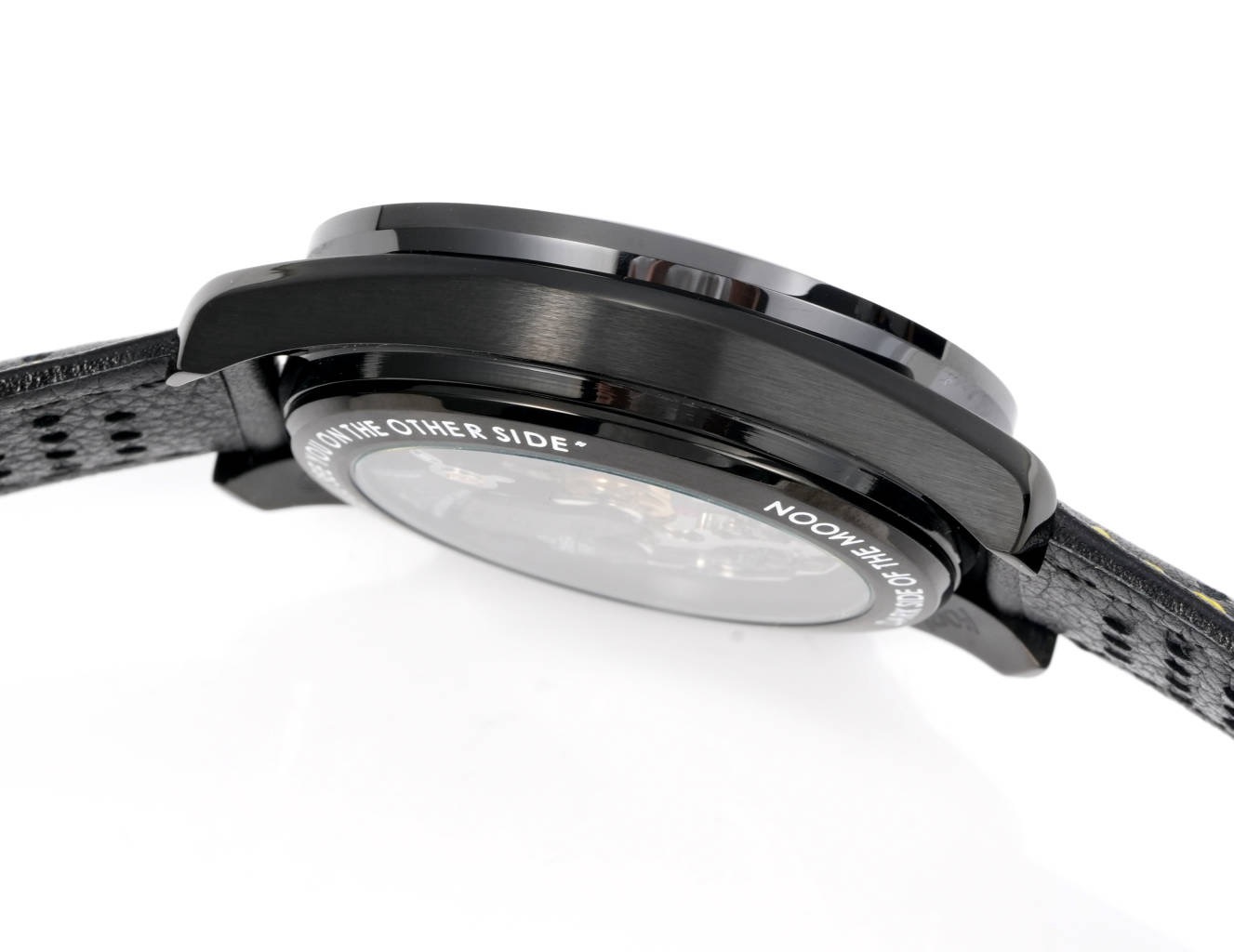 In this 44.25 mm model, the Speedmaster’s lunar history is celebrated on the blackened movement, which has been laser-ablated to represent the moon’s surface. The near side can be seen through the blackened skeletonised dial, while the far side can be seen through the caseback.