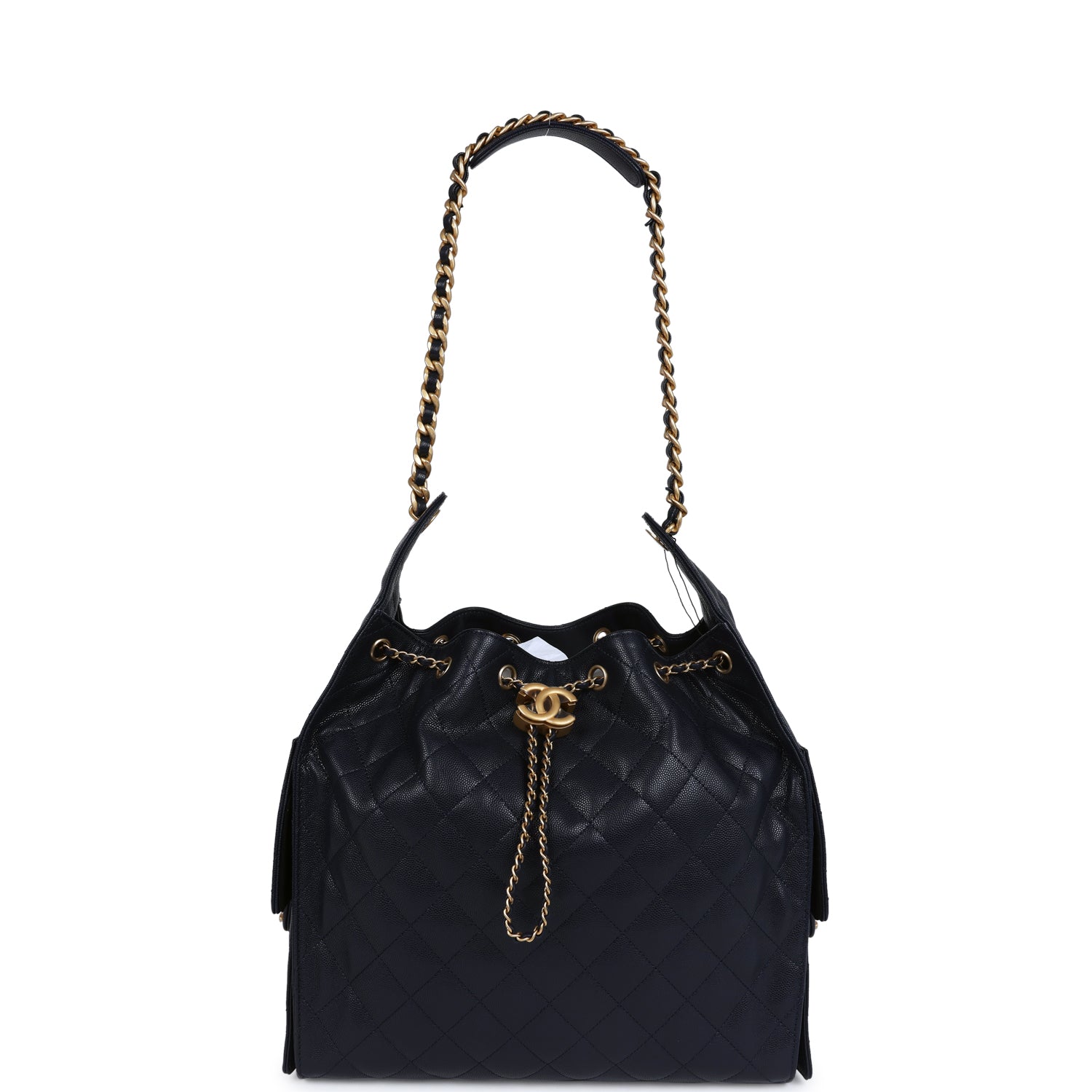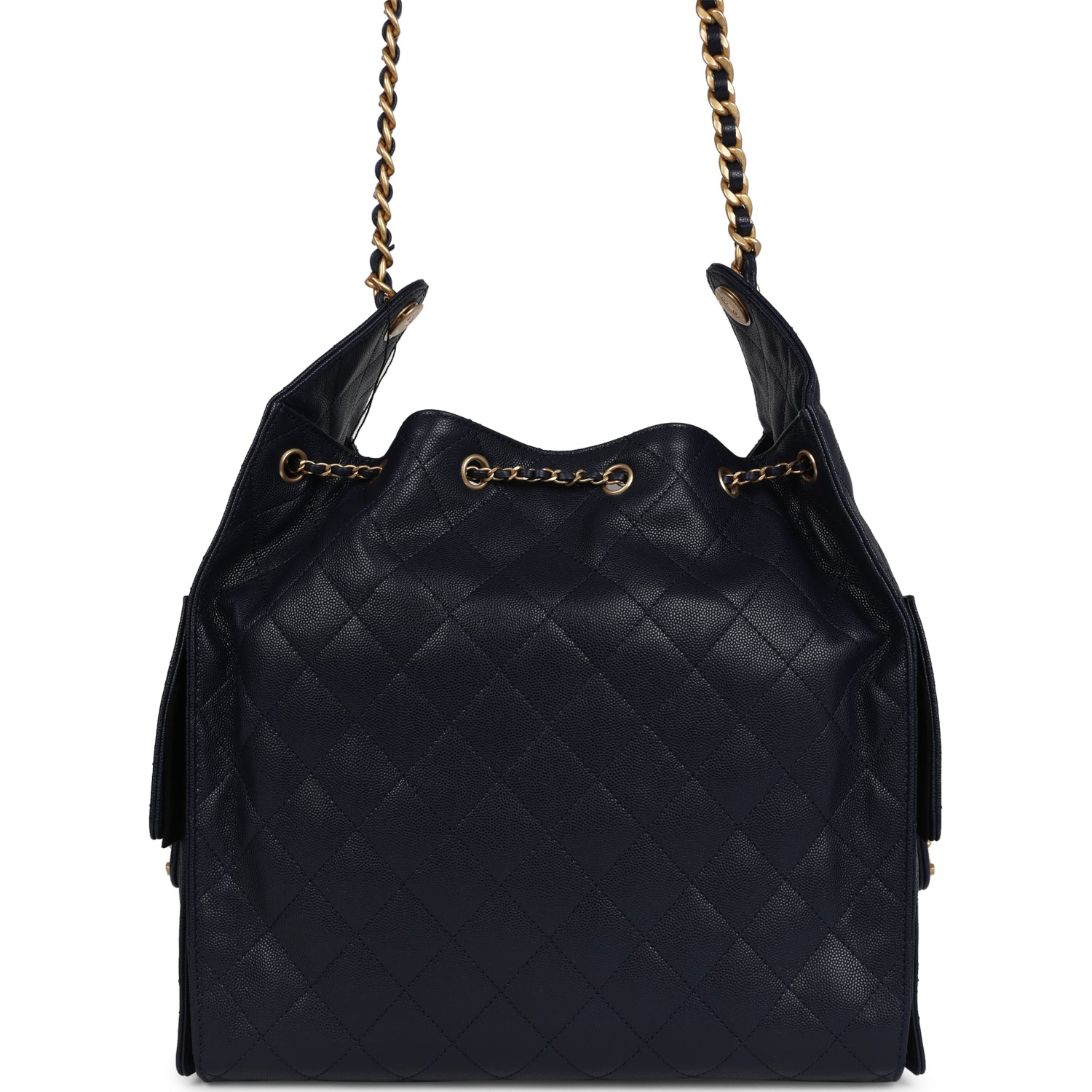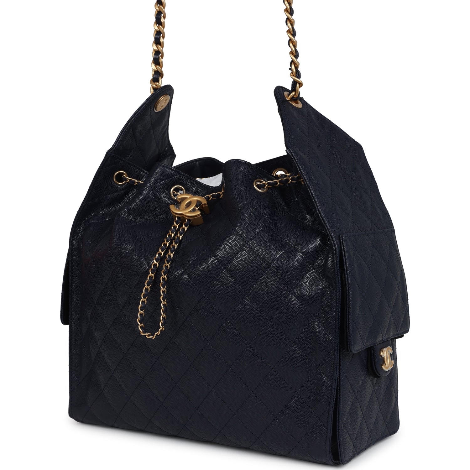 This Chanel Medium 25 Hobo Bag is in dark navy caviar leather with antique gold hardware, features signature diamond quilt, two exterior side pockets, drawstring closure, a removable pouch, and a single interwoven antique gold and dark navy leather shoulder strap.
