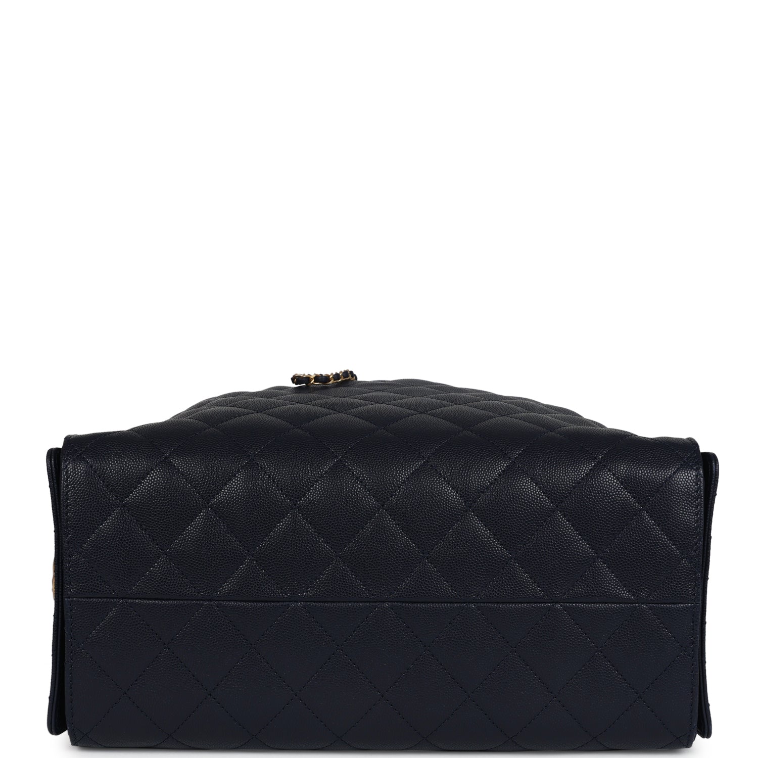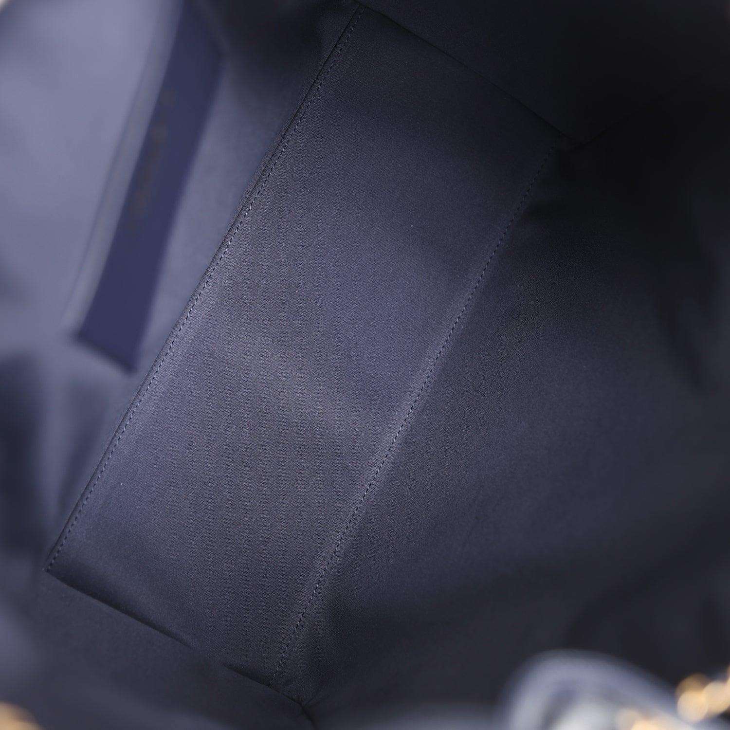 The interior is lined in dark navy grossgrain fabric and has three small slit pockets; one on the rear wall and one slit pocket on each interior side
