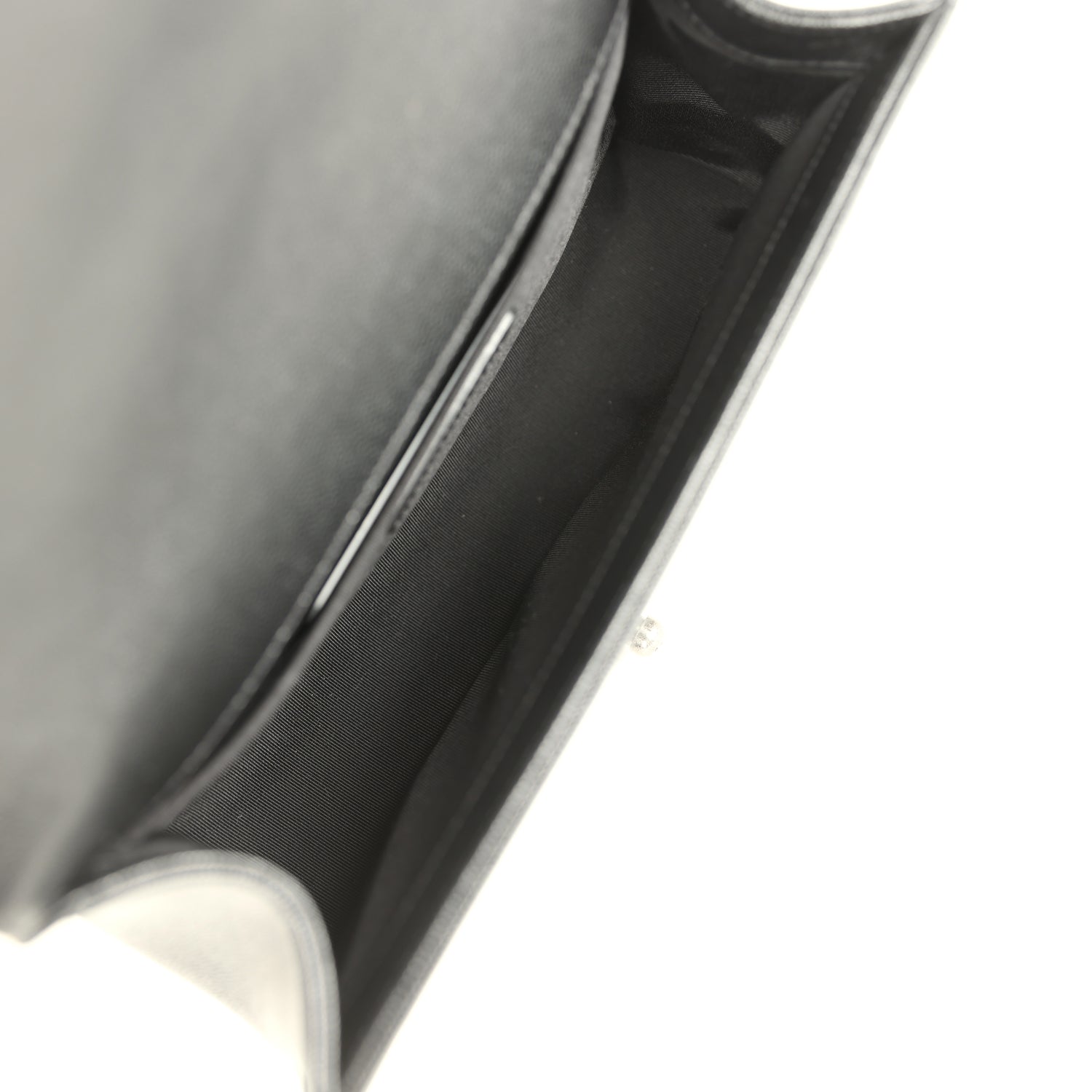 The interior is lined in black leather and has one slit pocket on rear wall.