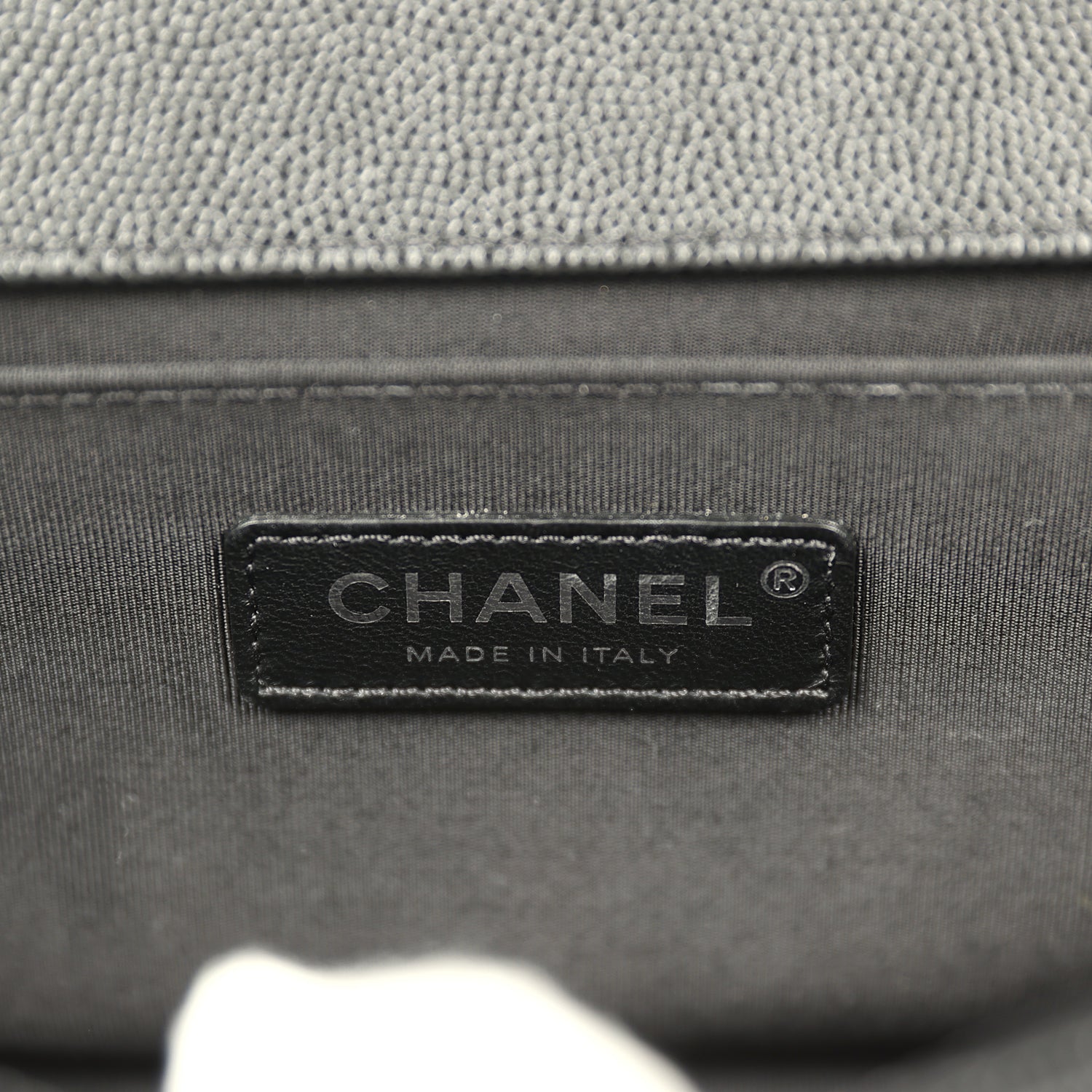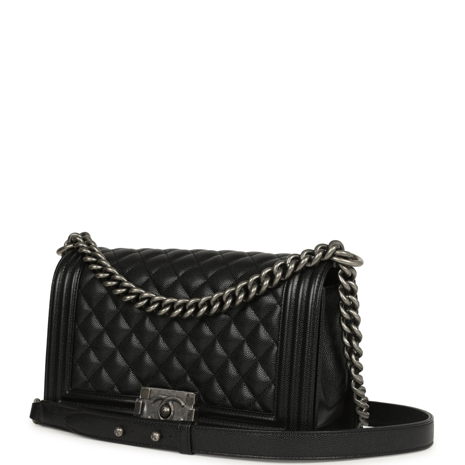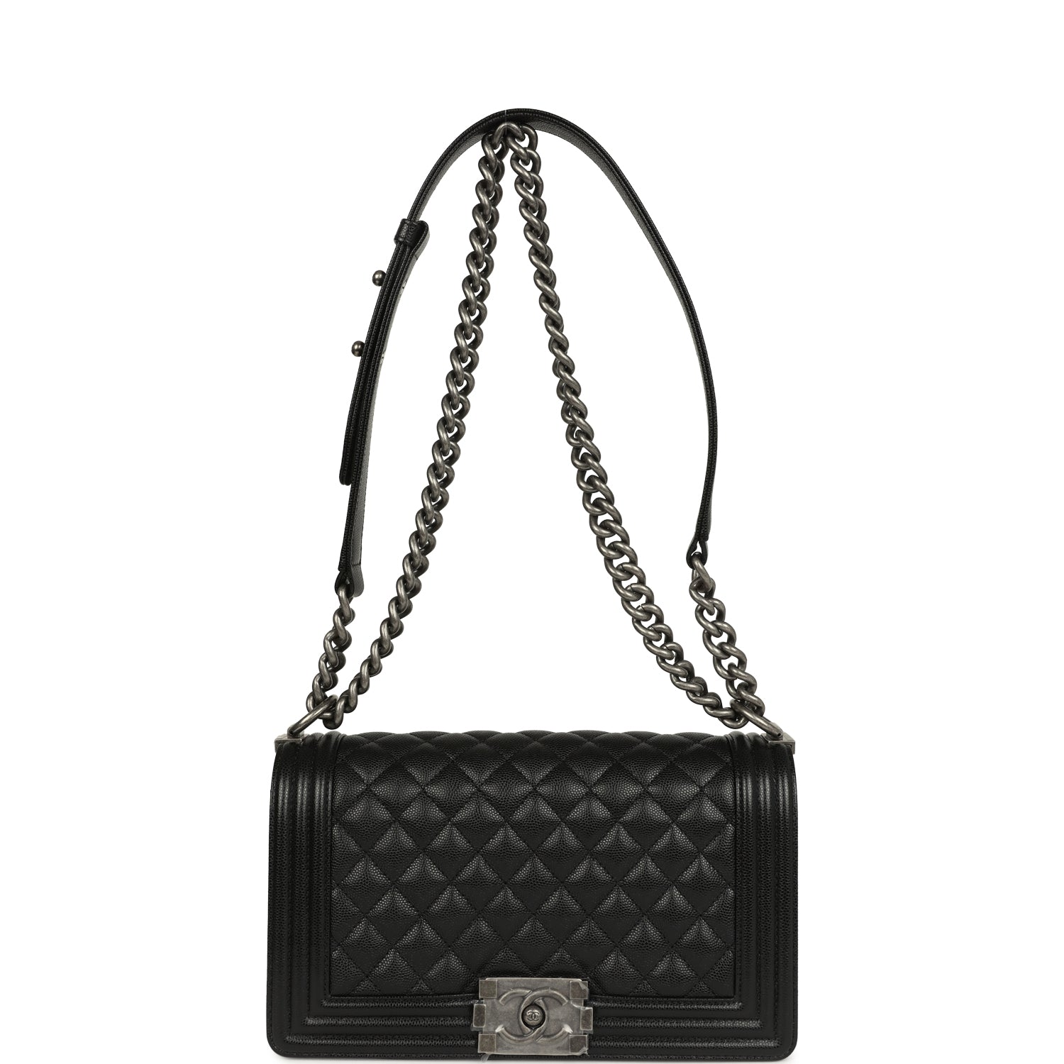 This?Old Medium Boy Bag is in black caviar leather with aged ruthenium hardware, featuring tonal stitching, front flap with Le Boy CC push closure, smooth calfskin leather trim, and aged ruthenium chainlink and black leather shoulder strap.