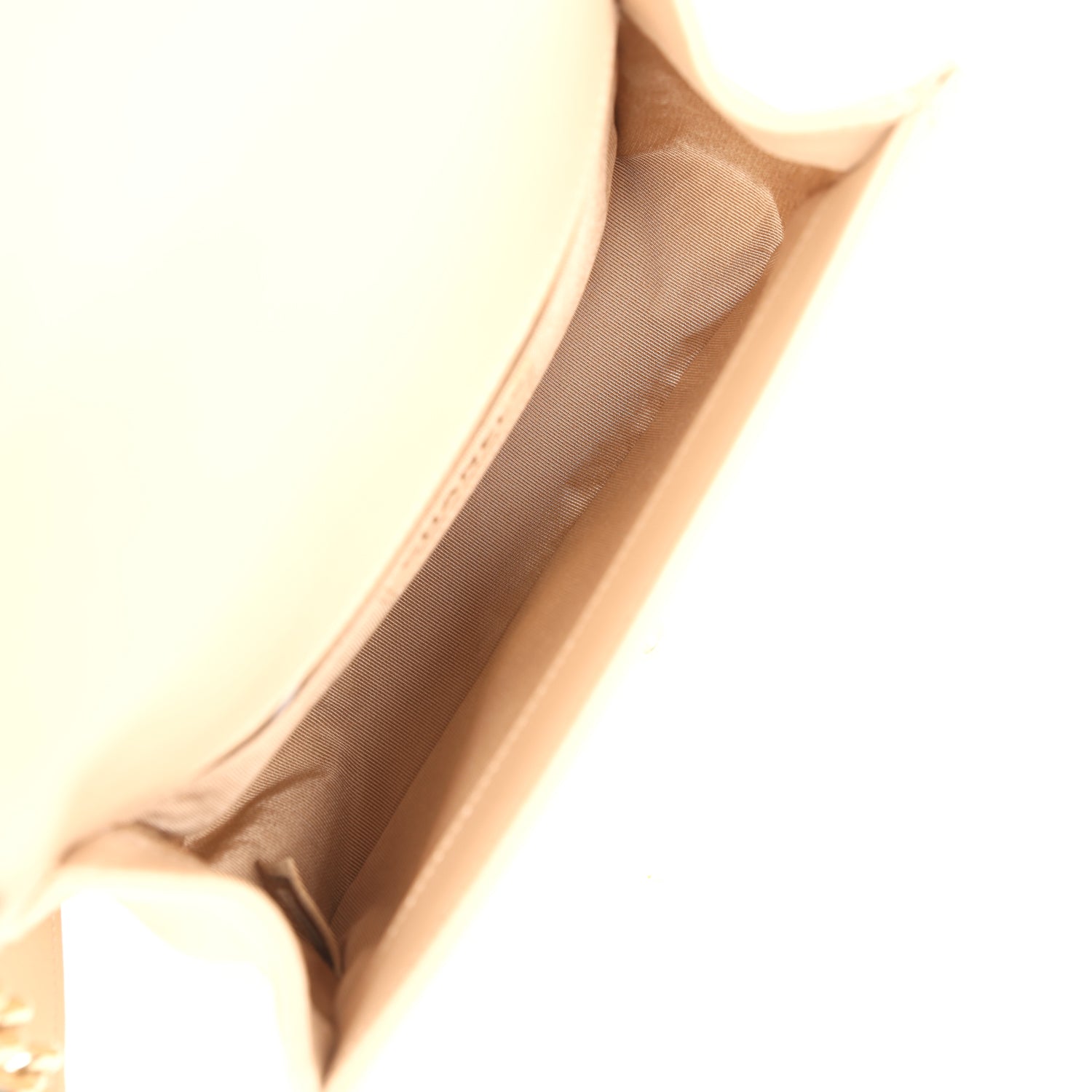 This Small Boy Bag is in beige lambskin leather with light gold tone hardware, and features tonal stitching, front flap with Le Boy CC push closure, smooth leather trim, and light gold tone chain link and beige leather shoulder strap.