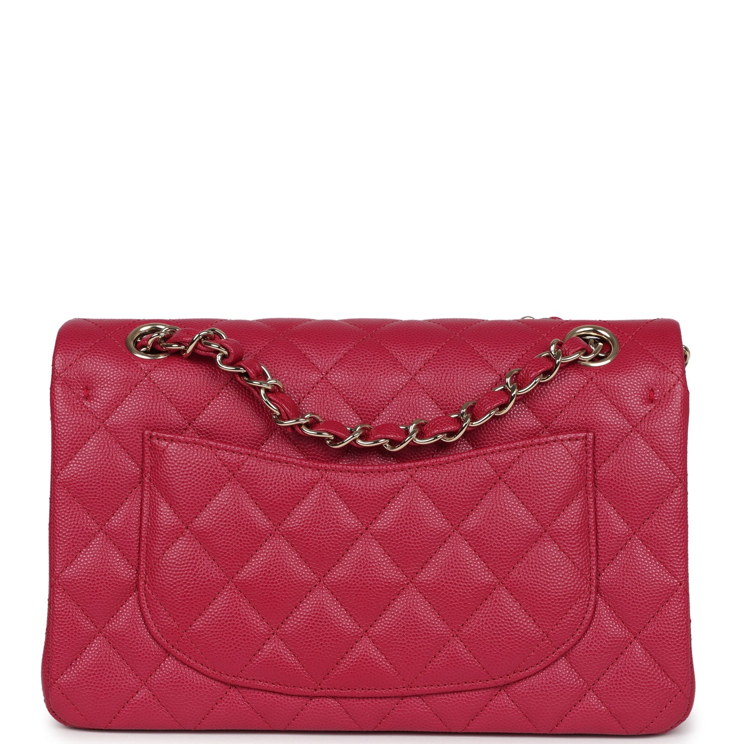 This small Classic Double Flap bag is in dark pink caviar leather with light gold tone hardware and features a front flap with signature CC turnlock closure, half moon back pocket, and adjustable interwoven light gold tone chain link and dark pink leather shoulder strap.