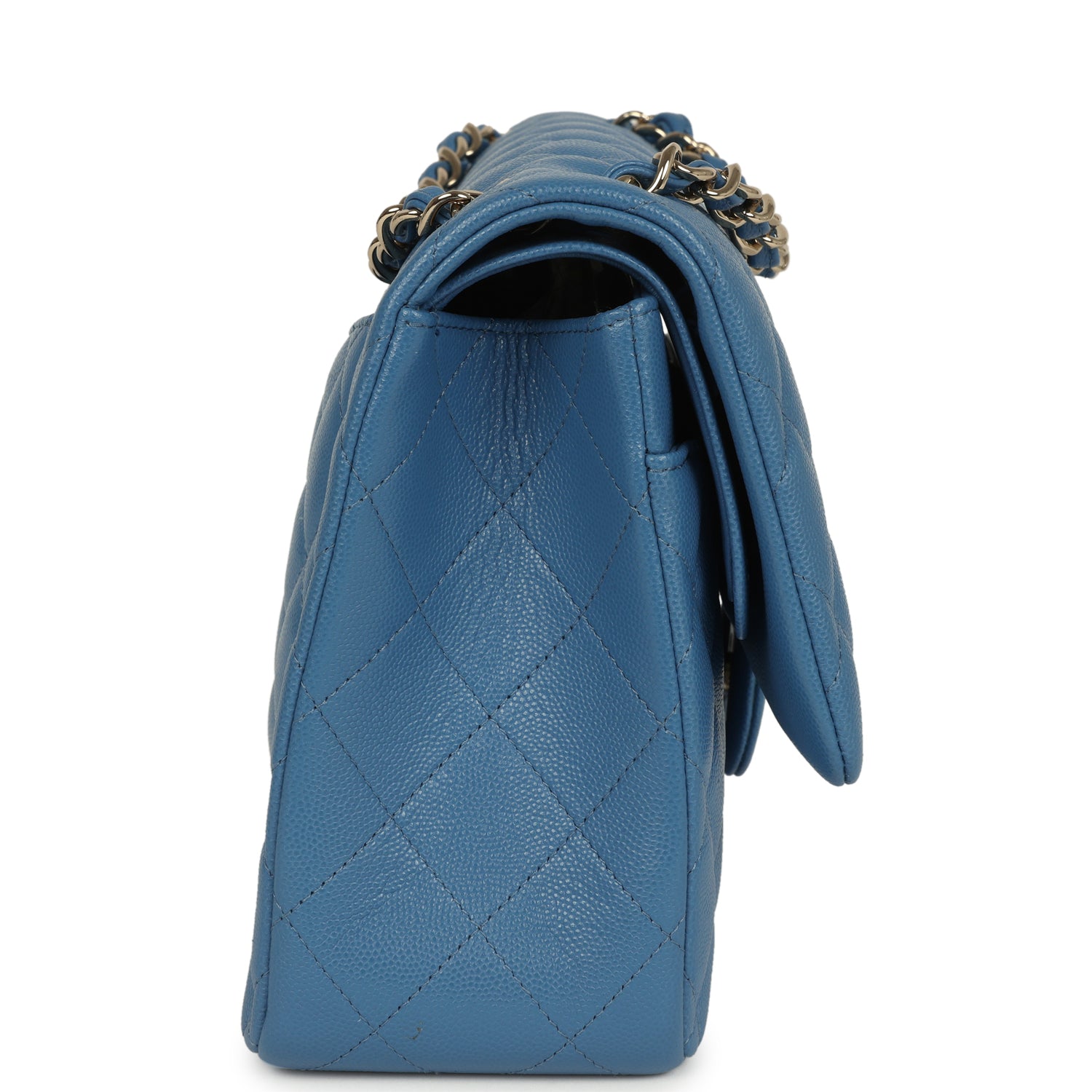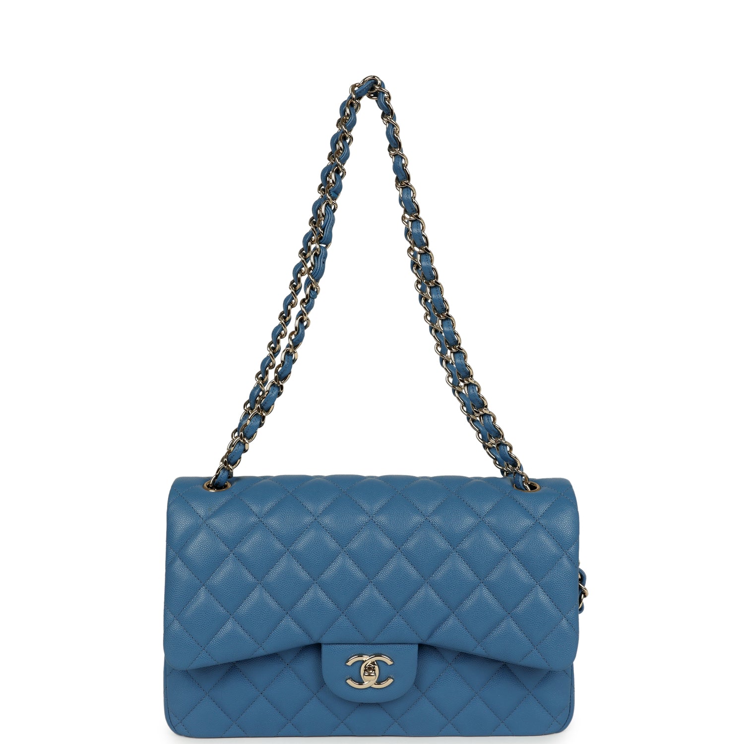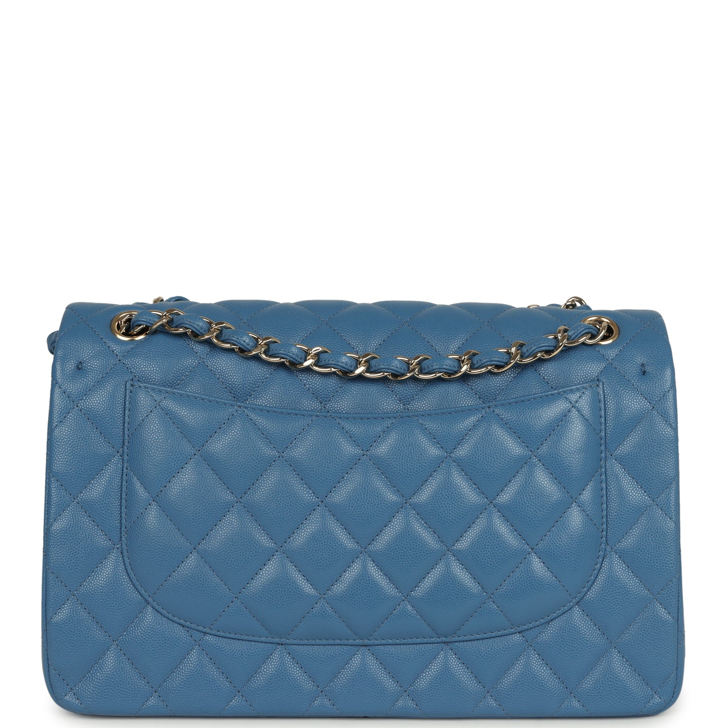 This?Jumbo Classic Double Flap bag is in blue caviar leather with silver tone hardware, front flap with CC turnlock closure, half moon back pocket and adjustable interwoven silver tone chain link and Blue leather shoulder/crossbody strap.