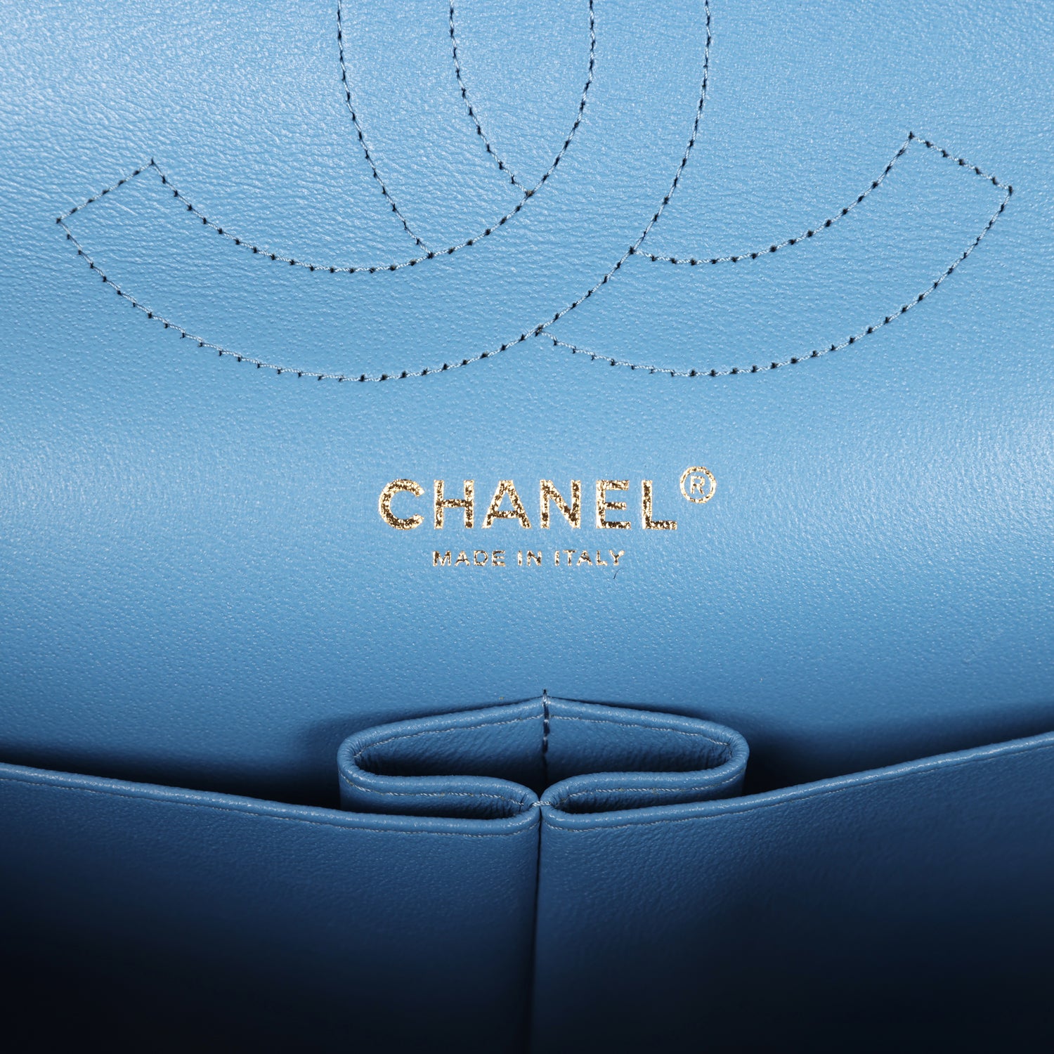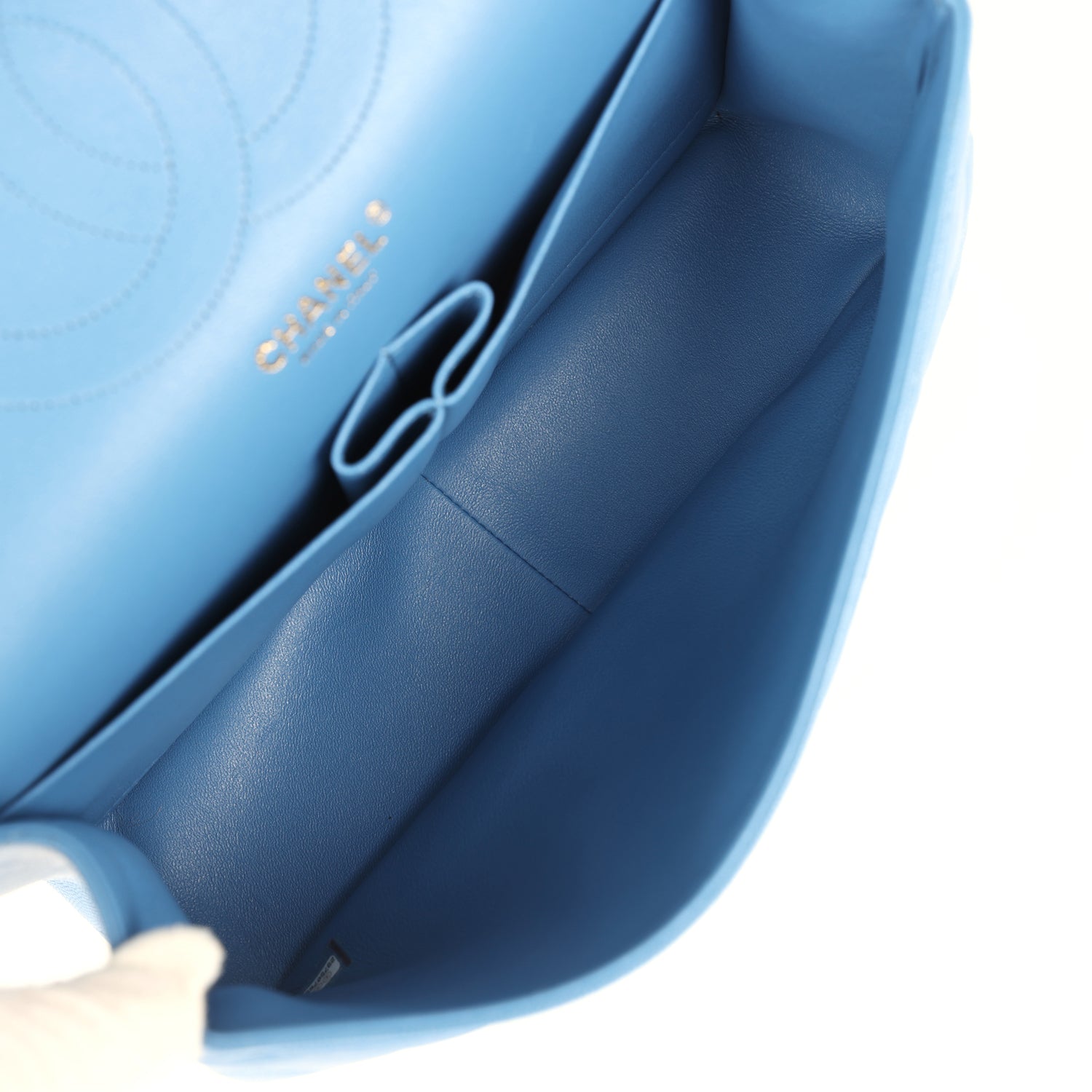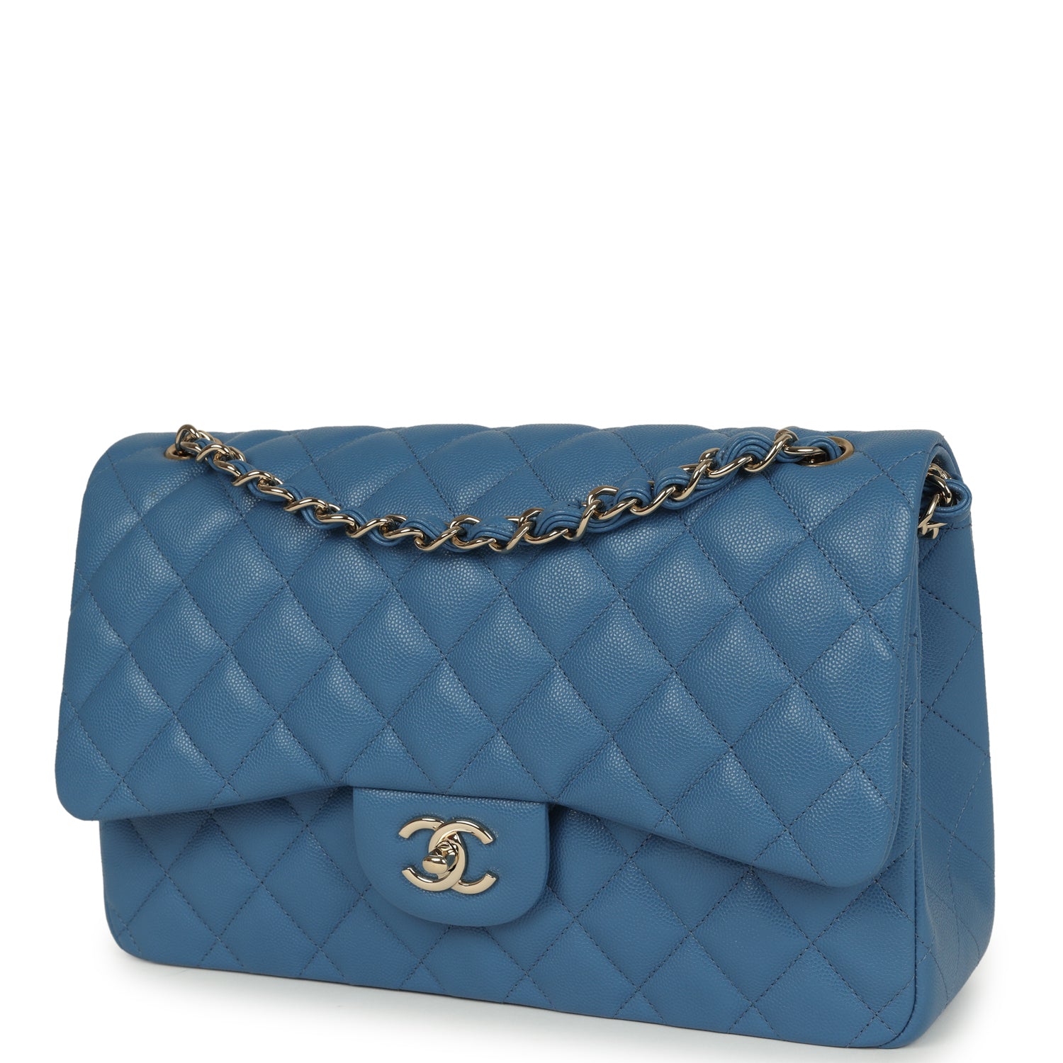 This?Jumbo Classic Double Flap bag is in blue caviar leather with silver tone hardware, front flap with CC turnlock closure, half moon back pocket and adjustable interwoven silver tone chain link and Blue leather shoulder/crossbody strap.