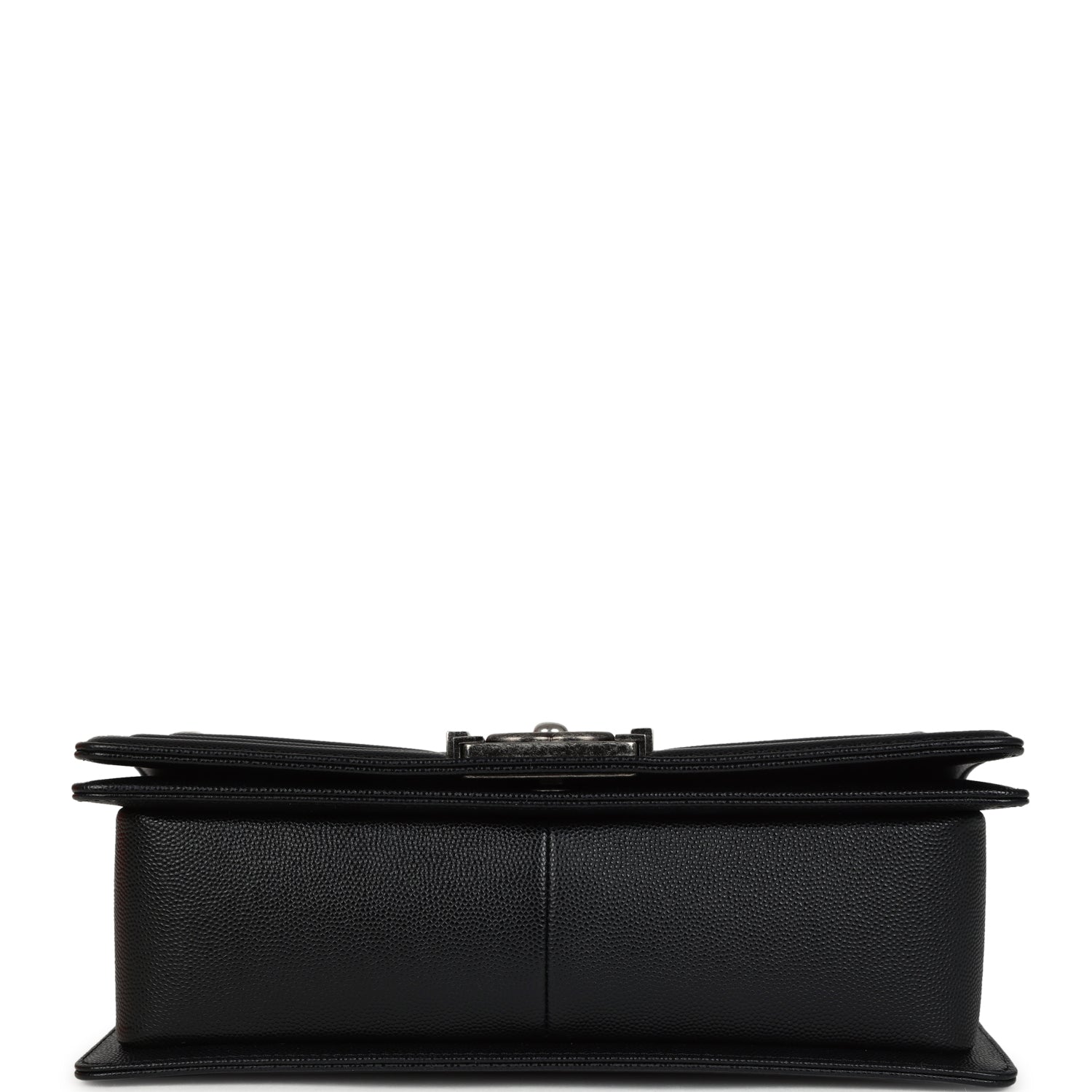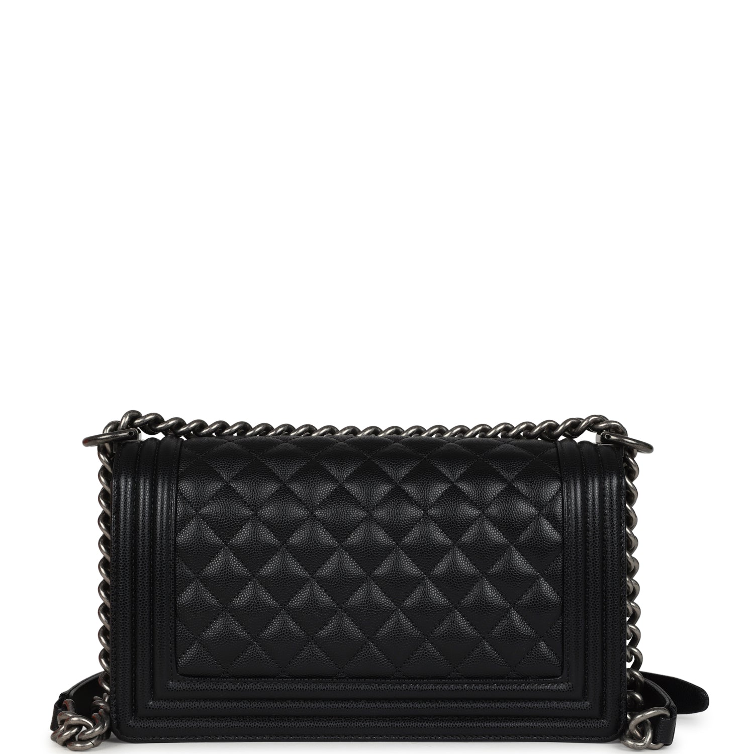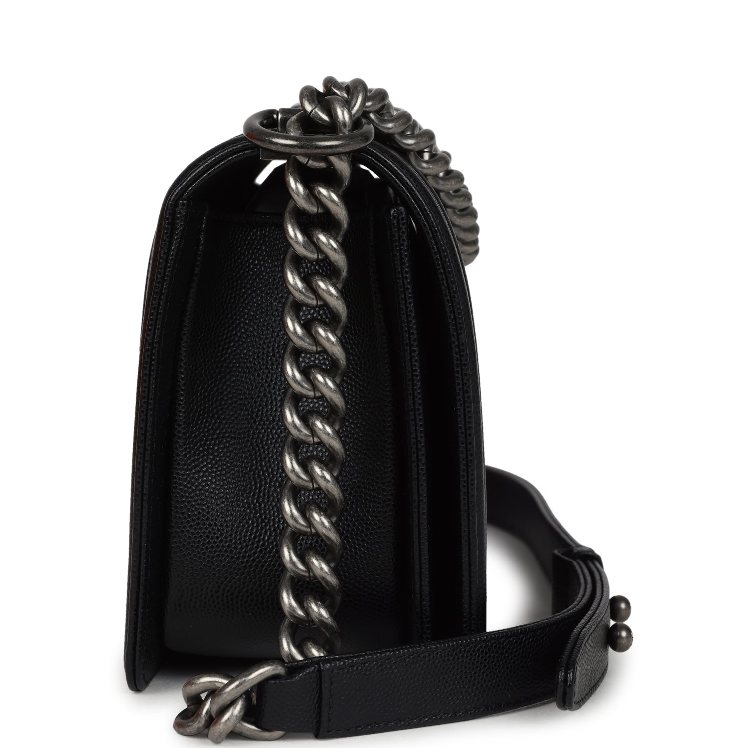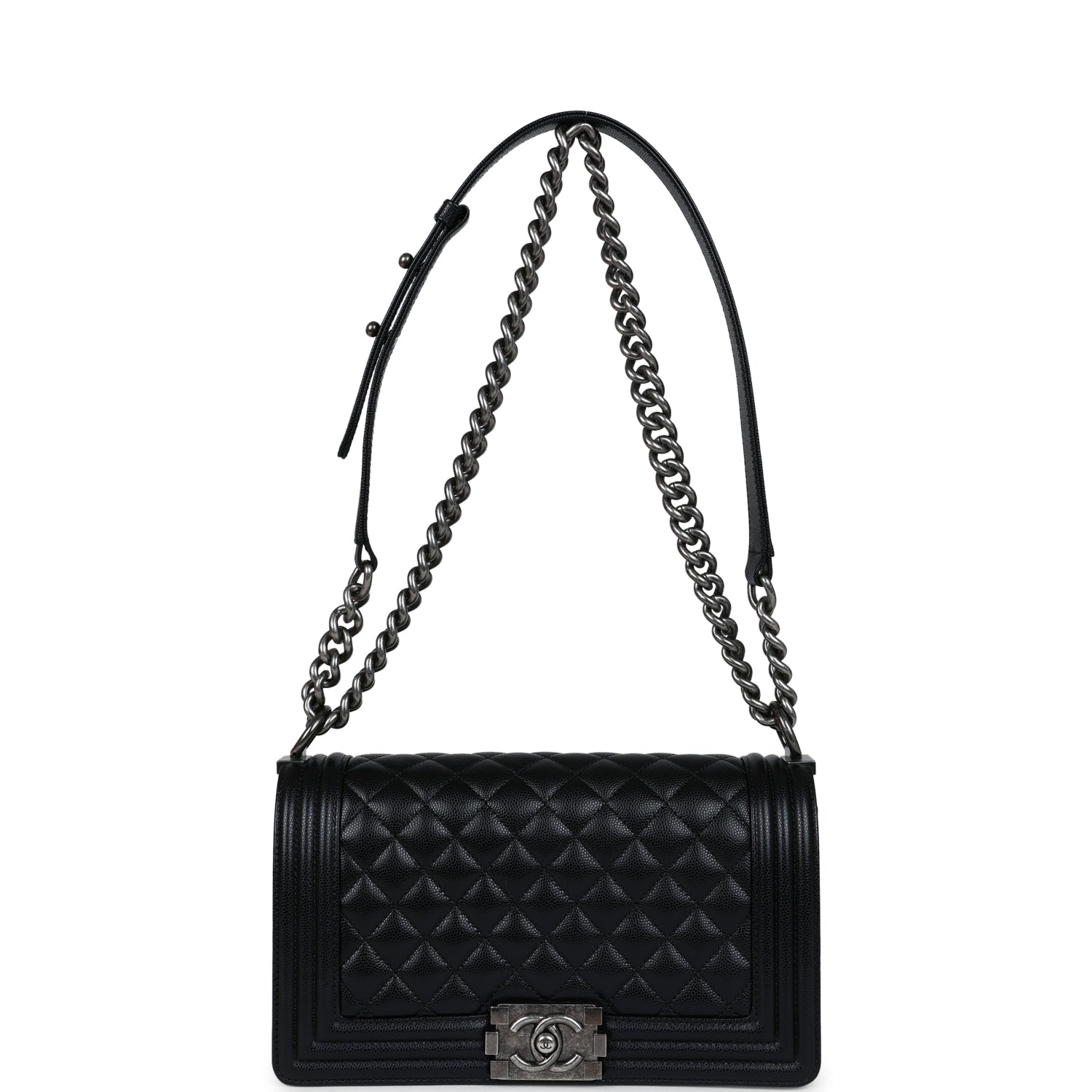 This Old Medium Boy Bag is in black caviar leather with aged ruthenium hardware, featuring tonal stitching, front flap with Le Boy CC push closure, caviar leather trim, and aged ruthenium chainlink and black leather shoulder strap.