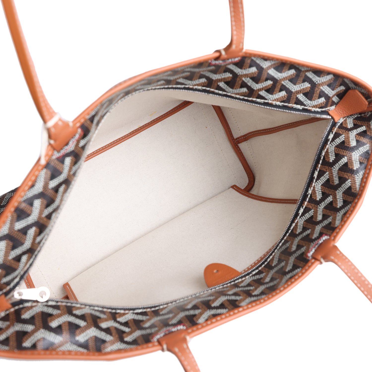 This Artois PM tote is of black Goyardine canvas and brown chevroches calfskin leather, with palladium hardware and features contrast stitching, a zipper closure, and a floating interior pocket.